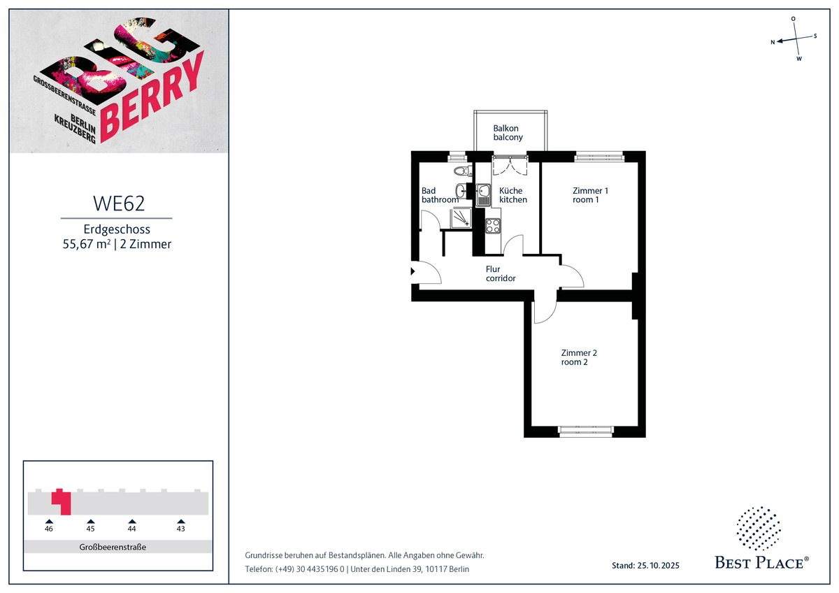 Big Berry befindet sich am südlichen Ende der Großbeerenstraße, nördlich des Viktoriaparks. Dank der zentralen Lage können Sie hier fast alles bequem zu Fuß oder mit dem Fahrrad erledigen. Innerhalb eines Radius von etwa 200 Metern finden Sie die Charlotte Salomon Grundschule und die Adolf Glaßbrenner Grundschule. Die nächste Bushaltestelle sowie die U-Bahn-Stationen Mehringdamm (U6/U7) und Platz der Luftbrücke (U6) sind ebenfalls in unmittelbarer Nähe, sodass Sie eine hervorragende Anbindung an den öffentlichen Nahverkehr haben.