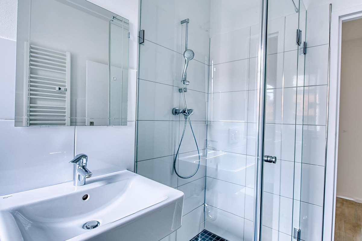 Jede Wohnung verfügt über zwei hochwertig ausgestattete Bäder, die jeweils eine Badewanne oder eine bodengleiche RainshowerDusche besitzen. Handverlesene Markenfabrikate, elegante Armaturen und schöne, großformatige Fliesen sorgen für einen hohen Wellness-Faktor. Das i-Tüpfelchen: Einige Wohnungen verfügen über ein En-Suite Bad.