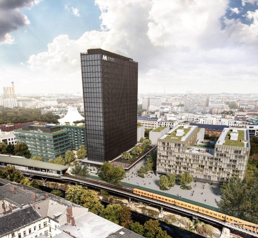 Wir bleiben in Kreuzberg: Zwischen dem Anhalter Bahnhof, dem Tempodrom und dem Kanal entwickelt die UTB Projektmanagement GmbH mit Sitz in Berlin das Wohnhochhaus „WoHo“. Mit 98 Metern und 29 Etagen soll das Holz-Hybrid-Hochhaus nach UTB-Angaben Deutschlands höchstes aus Holz erbaute Gebäude werden, nur der Kern und das Untergeschoss ist mit Stahlbeton geplant. Vier Baukörper sollen auf dem Grundstück an der Schöneberger Straße entstehen. Im 29. Stock des Hauptturmes ist ein öffentlicher Dachgarten mit 360-Grad-Sicht über Berlin vorgesehen. Mit der Fertigstellung wird frühestens ab 2026 gerechnet.