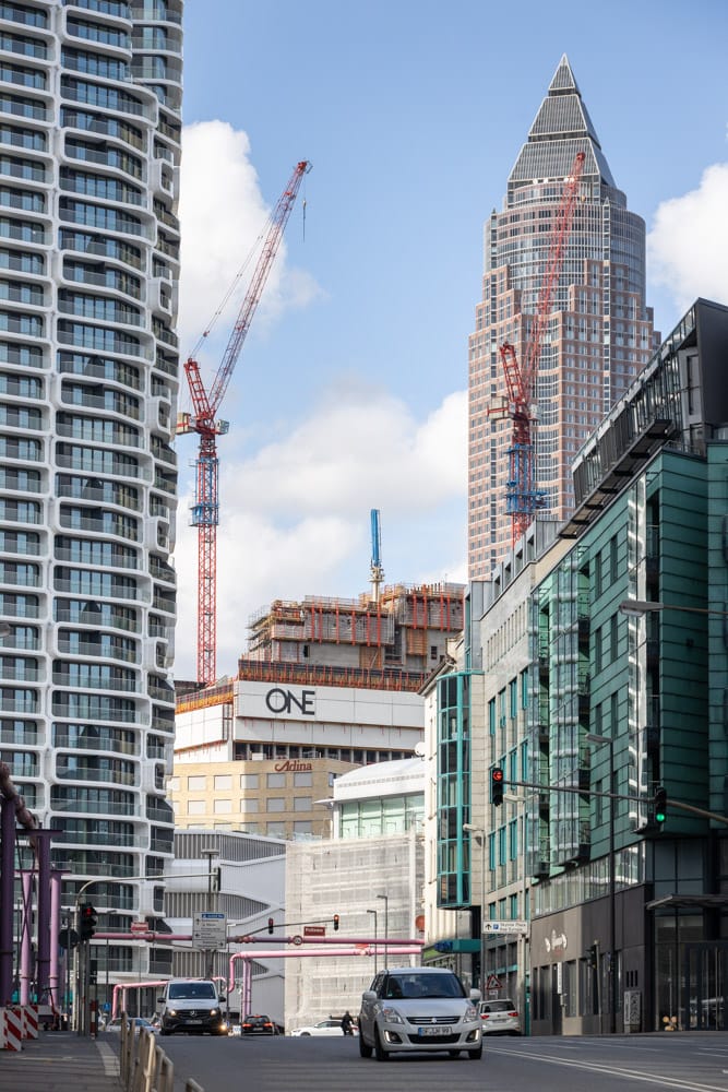 Ebenfalls in der unmittelbaren Umgebung des im Bau befindenden ONE: der Messeturm Frankfurt (rechter Turm im Bild):