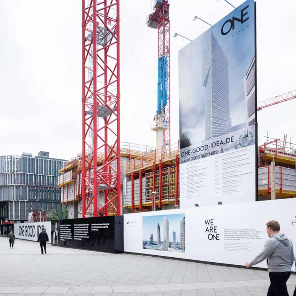 Der Büro- und Hotelturm ONE mit einer vermietbaren Nutzfläche von 68.000 Quadratmetern entsteht in Frankfurts Brüsseler Straße 1-3: an der Schnittstelle des Frankfurter Bankenviertels, der Messe Frankfurt und dem Europaviertel.