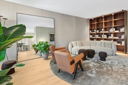 Mit der Fertigstellung der ersten Musterwohnung bietet das Cocoon-Projekt am Zoopark einen ersten Einblick in seine architektonische Eleganz und die außergewöhnliche Inneneinrichtung. „Das Interior Design-Team von citizenhome hat im Cocoon eine harmonische Mischung aus modernem Luxus und zeitloser Eleganz geschaffen,“ so Iris Kiniziak von BÖCKER-Wohnimmobilien. Eine verspiegelte Wand im langen Flur fängt das natürliche Licht ein und erhellt den Raum. Ein halbrundes Moroso-Sofa im Zentrum des Wohnraums lädt neben der raumhohen Bibliothek zum Verweilen ein. Im Wohnbereich harmonieren Design-Klassiker von Cassina wie die Le Corbusier Chaiselongue und der Capitol Complex Sessel perfekt miteinander. Einen spannenden Akzent setzt zudem die kannelierte Wandverkleidung von Élitis. Der elliptische Saarinen-Tisch aus schwarzem Marmor bildet dabei einen interessanten Kontrast zu den cremefarbenen Dudet-Sesseln. Das extravagante Lichtsystem des Designers Stefan Diez setzt die Essgruppe stilvoll in Szene.