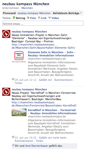 Unsere Partner-Webseite, das Bauträger-Portal neubau kompass München bietet ab sofort einen neuen Service an: Nutzer von Facebook können regelmäßig Informationen über neue Bauvorhaben im Großraum München direkt in ihren „news stream“ auf Facebook erhalten.