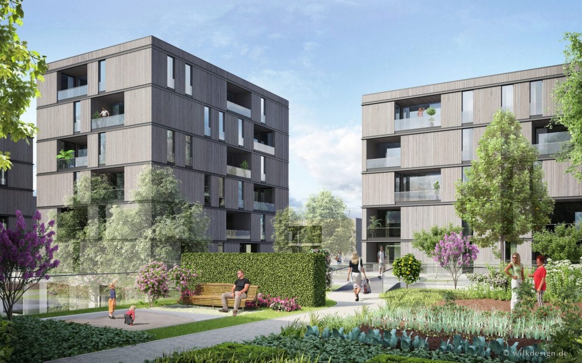 Wo viel Grün ist, bedarf es viel Wassers. Die Architekten integrieren Rückhaltesysteme auf den begrünten Dächern, die das Regenwasser sammeln und eine komfortable Bewässerung ermöglichen. Dazu kommen Grundwasserbrunnen. Zur Förderung des Artenschutzes werden Nisthilfen für Vögel und Fledermäuse in die Gebäudefassade implementiert. Die Wohngebäude präsentieren sich nicht nur mit ihrem Holzgewand im Zeichen der Nachhaltigkeit: Sie verfügen unter anderem über eine hochwertige Wärmedämmung an der Fassade und den Fenstern sowie eine dezentrale Lüftung mit Wärmerückgewinnung. Eine Vielzahl von Photovoltaikmodulen unterstützt den ressourcenschonenden Gebäudebetrieb.