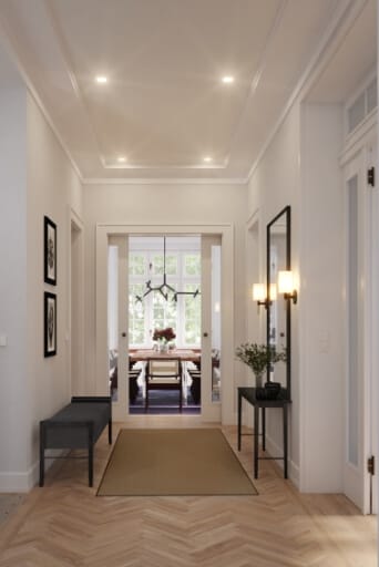 Lange Dielen stellen eine besondere Herausforderung dar. Um die Länge optisch zu brechen, kannst du mehrere Teppiche oder einen langen Läufer in einem auffälligen Design verwenden. Möbel, die auf einer Seite des Foyers platziert sind, wirken weniger chaotisch und schaffen klare Sichtachsen. Helle Wände und eine gute Beleuchtung lassen den Bereich freundlicher wirken. Wandleuchten oder Bilder entlang des Vorzimmers bereichern die Ästhetik. Verwende außerdem schmale Konsolen oder Regale, um den Platz effizient zu nutzen. Setze zudem auf verschönernde Elemente wie große Pflanzen oder Kunstwerke, um ein lebendiges, schönes Entrée zu kreieren. Für die richtige Beleuchtung sind mindestens zwei Deckenleuchten empfehlenswert.