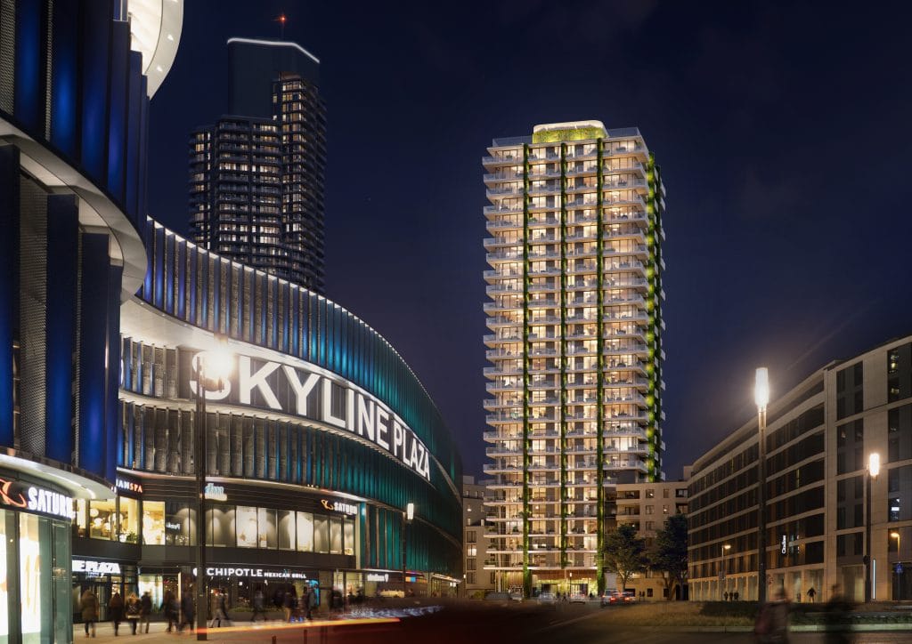 Europaviertel Frankfurt: In der Nachbarschaft zum Shopping-Zentrum Skyline Plaza, entsteht derzeit der EDEN Tower. Mit seinen 28 Stockwerken wird der EDEN Tower 98 Meter in den Himmel ragen und zukünftig die Frankfurter Skyline durch seine begrünte Fassade bereichern.