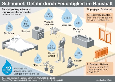 Wie sieht es aber mit der Heizung aus? Als ideale Temperaturen für ein gemütliches Wohnen mit einer optimalen Luftfeuchtigkeit gelten 18 °C im Schlafzimmer, 18 bis 20 °C in der Küche und 21 bis 23 °C im Bad, Wohnbereich und Kinderzimmer. Der Keller darf gern 10 bis 15 °C „kalt“ sein und eine Luftfeuchtigkeit von 50 bis 65 % haben. Die gemeinnützige Beratungsgesellschaft mbH co2online setzt die empfehlenswerten Zimmertemperaturen sogar niedriger an. „Bewusst“ und ohne Schimmelgefahr heizt man nach Ansicht der Experten, wenn man das Schlafzimmer auf 16 °C temperiert, die Wohnräume auf 20 °C einstellt und dem Bad ein Grad mehr, 21 °C, gönnt.