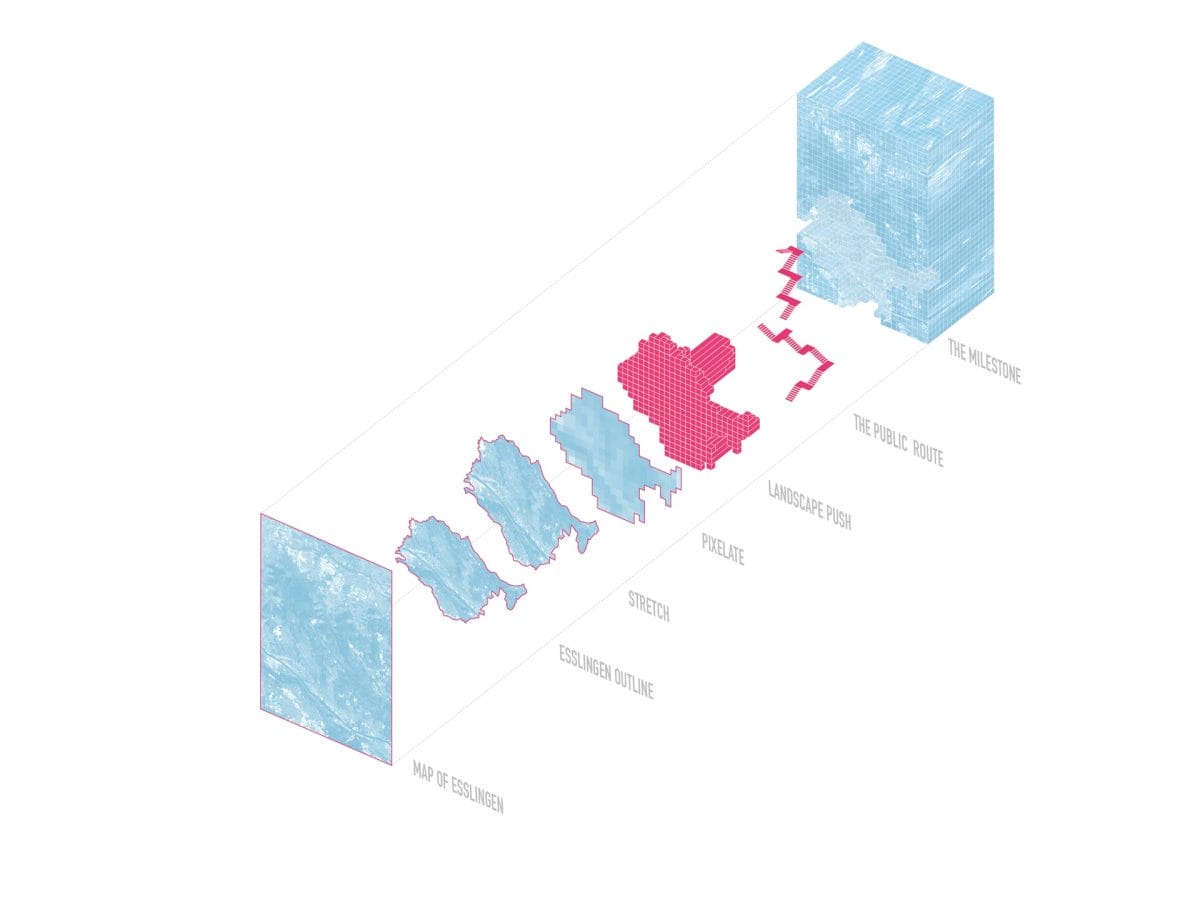 Übrigens: Die Fassade des „Crystal Rock“ zeichnet die Grenzen von Esslingen und die Topografie seiner Landschaft nach (siehe „Esslingen Outline“), die durch eine Reihe von Pixeln hineingeschoben wird, die einen „Esslinger-Raum“ bilden (siehe hinten in der Visualisierung unter „The Milestone“).