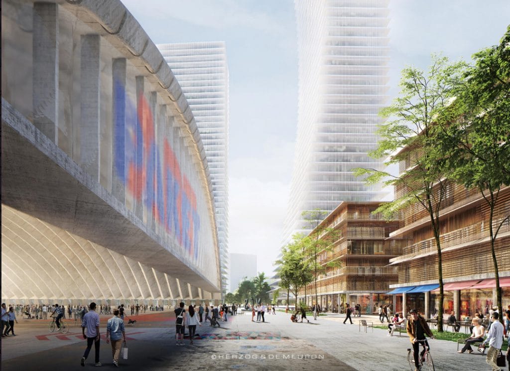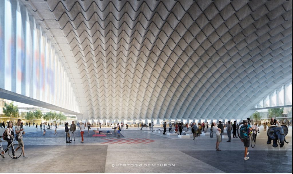 Mit dem Architektenbüro, das den Masterplan für die große Fläche erstellt, könnte die seit 1996 unter Denkmalschutz stehende Halle zu einer Fläche für Kultur, Konzerte, Kontakteknüpfen werden – mit einer 120 Meter langen Überdachung. Nach derzeitigen Zeichnungen würde die Halle auch visuell mit den beiden Türmen harmonieren, denn sie nimmt die geometrische Gestaltung der beiden Hochhäuser auf.