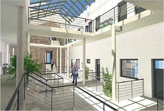 Jetzt verwandelt sich die alte Filmproduktionshalle zu einem neuen Atelierhaus. Die Animation des neuen Atelierhauses zeigt, wie dieses einmal innen aussehen soll – lichtdurchflutet, mit einem teilweise verglasten Dach: