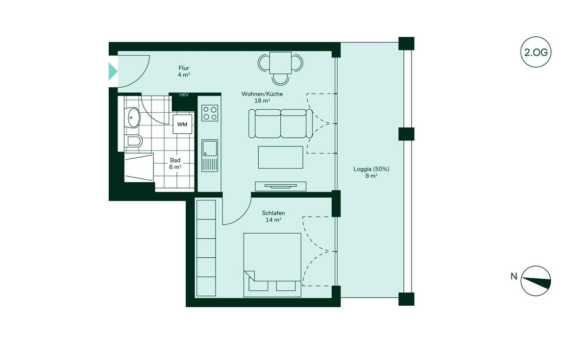 Im modernen Bad finden Sie Komfort und Funktionalität. Die Loggia lädt zu entspannten Momenten im Freien ein, während Sie die grüne Umgebung genießen. Ein durchdachtes Raumkonzept, das Wohnkomfort und Nachhaltigkeit vereint.