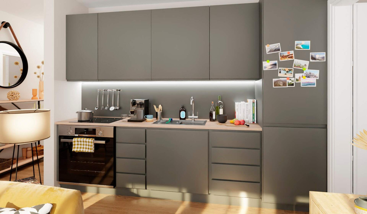 Betreten Sie Ihr neues Zuhause durch den einladenden Flur, der Sie direkt in den Wohnbereich führt. Hier vereinen sich Wohnen und Küche zu einem gemütlichen Ort, ideal für entspannte Abende. Das angrenzende Schlafzimmer bietet Ruhe und Erholung.