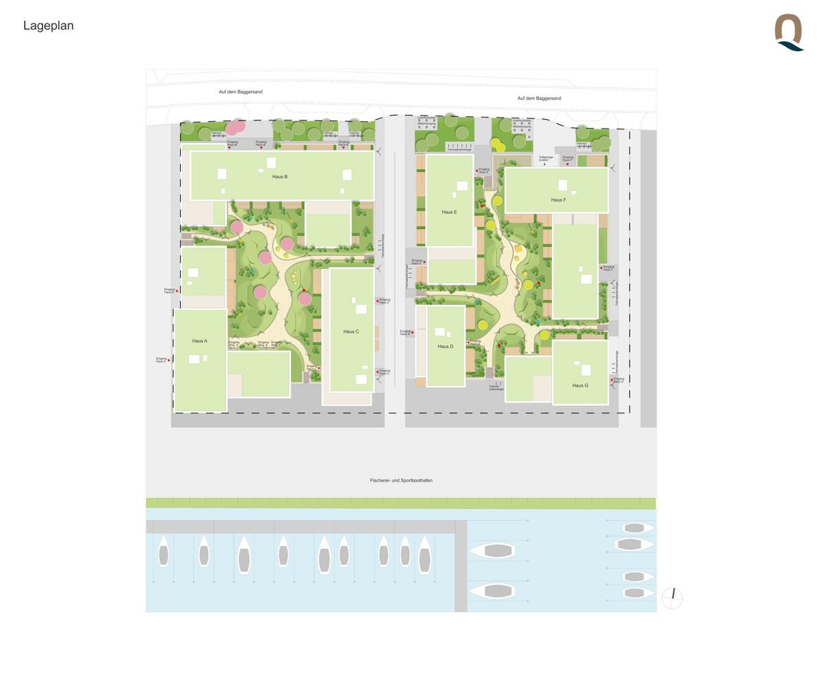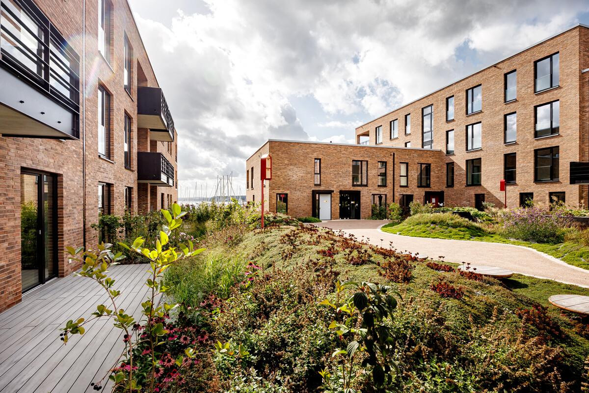 Der Reiz eines Fischereihafens, das faszinierende Milieu aus traditionellen Bootswerften und Fischereibetrieben – die Architektur atmet alles sensibel ein und komponiert daraus zwölf miteinander verwobene Häuser in unterschiedlichen Höhen und einer lang gezogenen Silhouette, die an das wogende Meer erinnert. Außen finden sich geschützte Loggien, innen öffnen sich Balkone mit einem fantastischen Blick über die sorgfältig und schön angelegten Innenhöfe – zur Travemündung und zum Priwall hin.