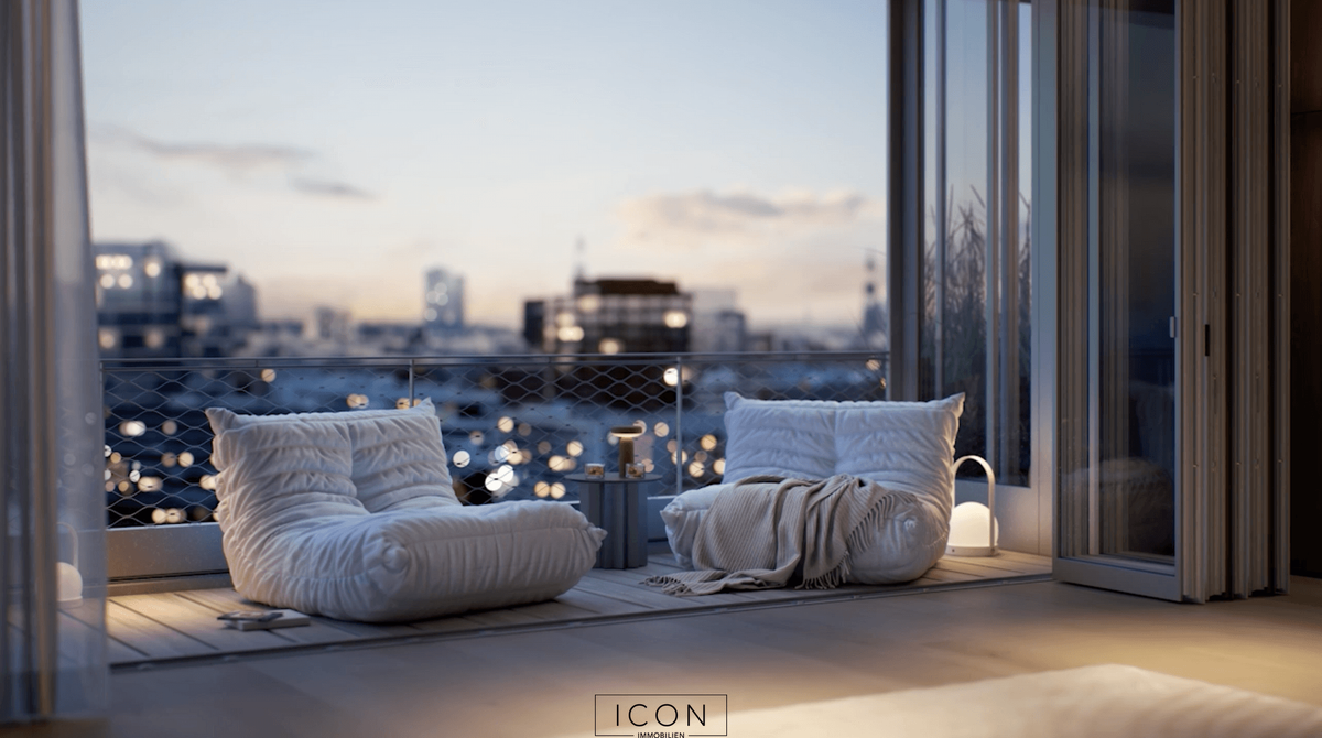 Bodentiefe Panoramafenster lassen den Blick über Hafen, Himmel und Horizont schweifen. Der umlaufende Balkon und die begrünten Außenbereiche holen die Natur direkt an Ihre Seite – für Momente der Ruhe mitten im urbanen Leben.