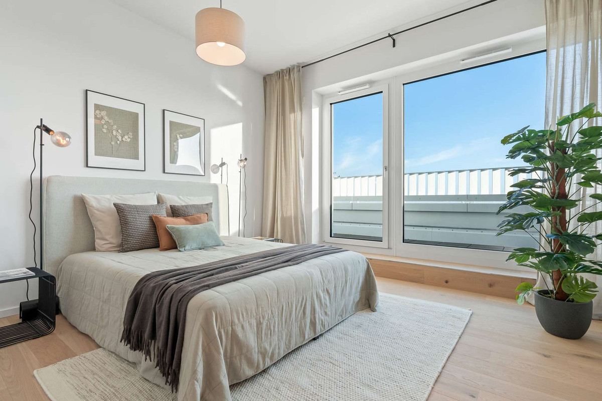 Hier erwartet dich eine Penthousewohnung im 4. Obergeschoss. Die modern geschnittene Wohnung verfügt über insgesamt 3 Zimmer, davon 2 Schlafzimmer, sowie ein Badezimmer und ein Gäste-WC mit hochwertiger Ausstattung. Der offene Wohn- und Essbereich mit seinen bodentiefen Fenstern sorgt für viel Tageslicht in der Wohnung und schafft eine helle und freundliche Atmosphäre. Diese Wohnung bietet Stil und Komfort: Echtholzparkett mit Fußbodenheizung sorgt für wohlige Wärme und das Bad ist mit hochwertigen Marken und großformatigen Fliesen zeitlos qualitativ ausgestattet. Ein separater Abstellraum in der Wohnung mit Anschluss für Waschmaschine und Trockner sowie ein separater Kellerraum sorgen für ausreichend Stauraum. Der barrierefreie Zugang mit dem Aufzug vom Keller bis auf die Wohnetage erleichtert den Alltag. Ein Sicherheitsplus bietet die Videogegensprechanlage.