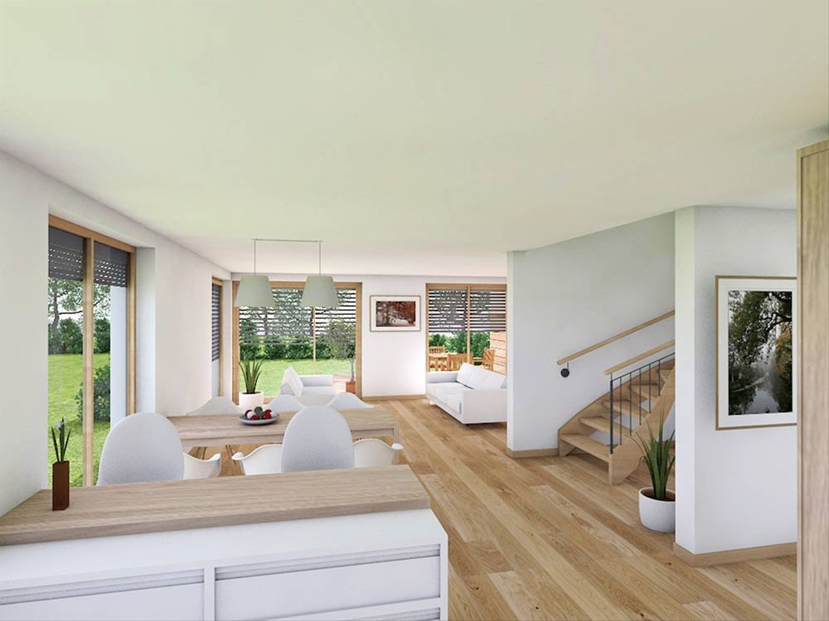 Der moderne Landhausstil spiegelt sich nicht nur in der massiven Holzfassade, den klassi-schen Fensterläden in moderner Ausführung, dem Vollholz-Eichenparkett sowie den maß-gefertigten Eichenfenstern wieder, sondern auch in den landestypischen Grundrissen, mit z. B. einer Speisekammer nahe der Küche