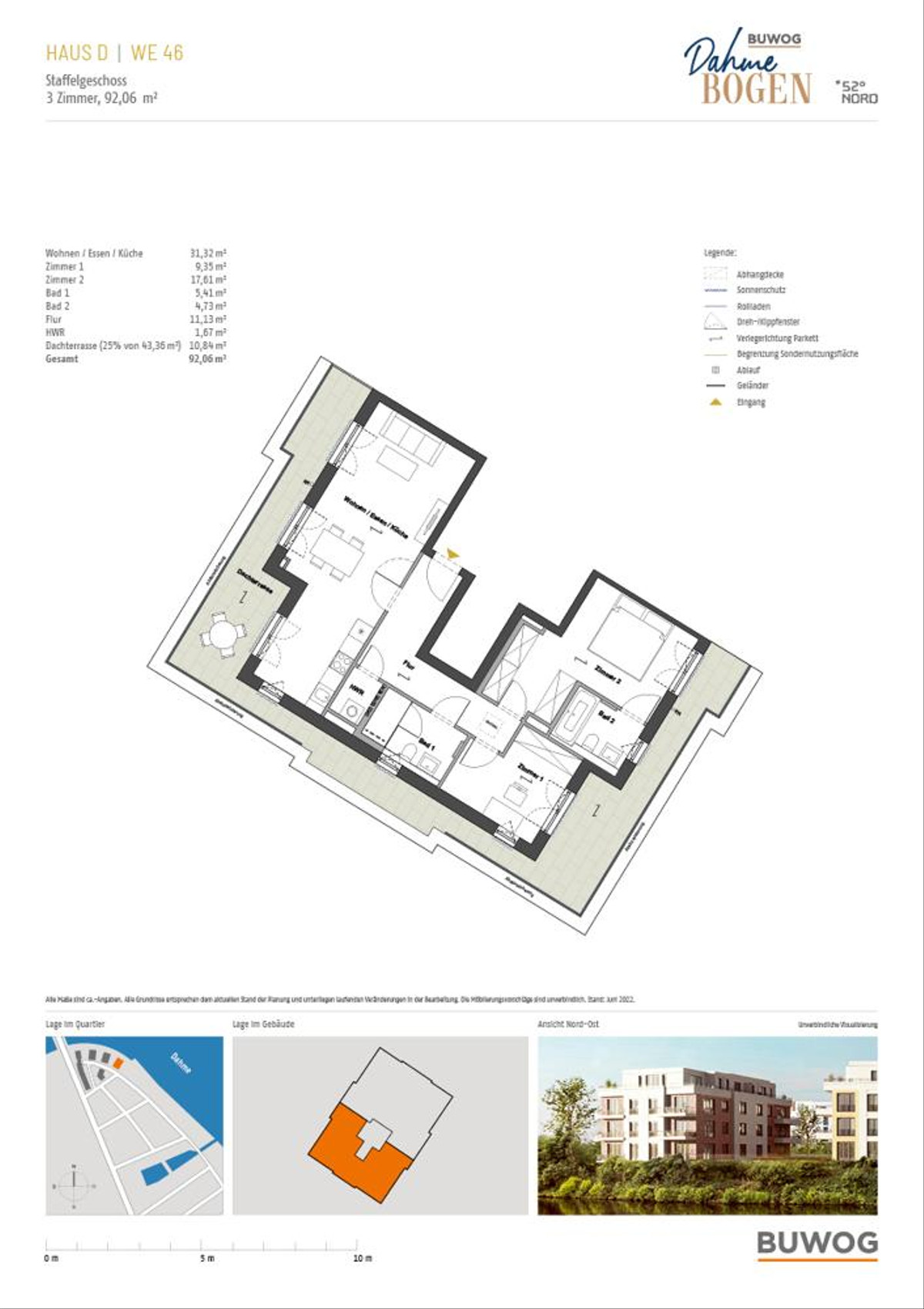 Mit BUWOG Dahmebogen haben die Architekten ein einzigartiges Gebäudeensemble konzipiert: Ein Turmgebäude bildet das markante Entrée des Gesamtquartiers und wird über ein Brückenbauwerk mit einem Mehrfamilienhaus verbunden. Dieses begrenzt den BUWOG Dahmebogen zur Regattastraße hin. Hinzu kommen drei klassisch-elegante Stadtvillen, die in einem Bogen zum Wasser ausgerichtet sind und ein weiteres L-förmiges Haus.