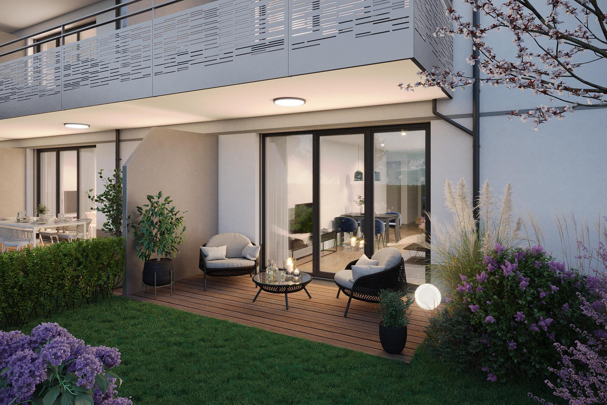 Bild Neubau Eigentumswohnungen Am Waldrand 13, Pulheim: Bild einer Gartenterrasse mit Menschen