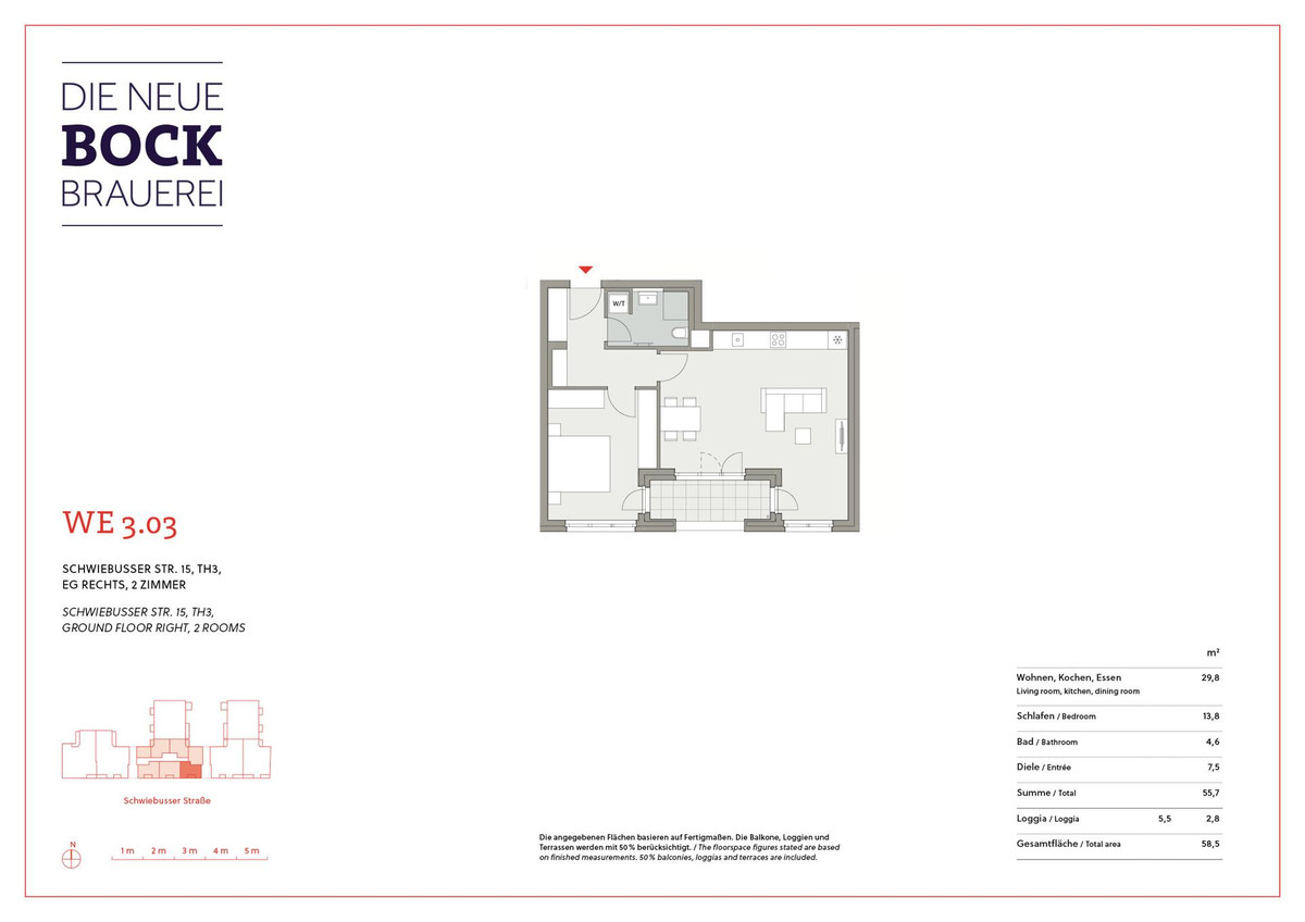 Der offene Wohn-, Koch- und Essbereich (ca. 29,8 m²) bildet das Herzstück und öffnet sich zur Loggia (ca. 5,5 m²). Das Schlafzimmer (ca. 13,8 m²) sorgt für Ruhe und Rückzug, während das moderne Bad und eine praktische Diele das Wohnangebot abrunden.