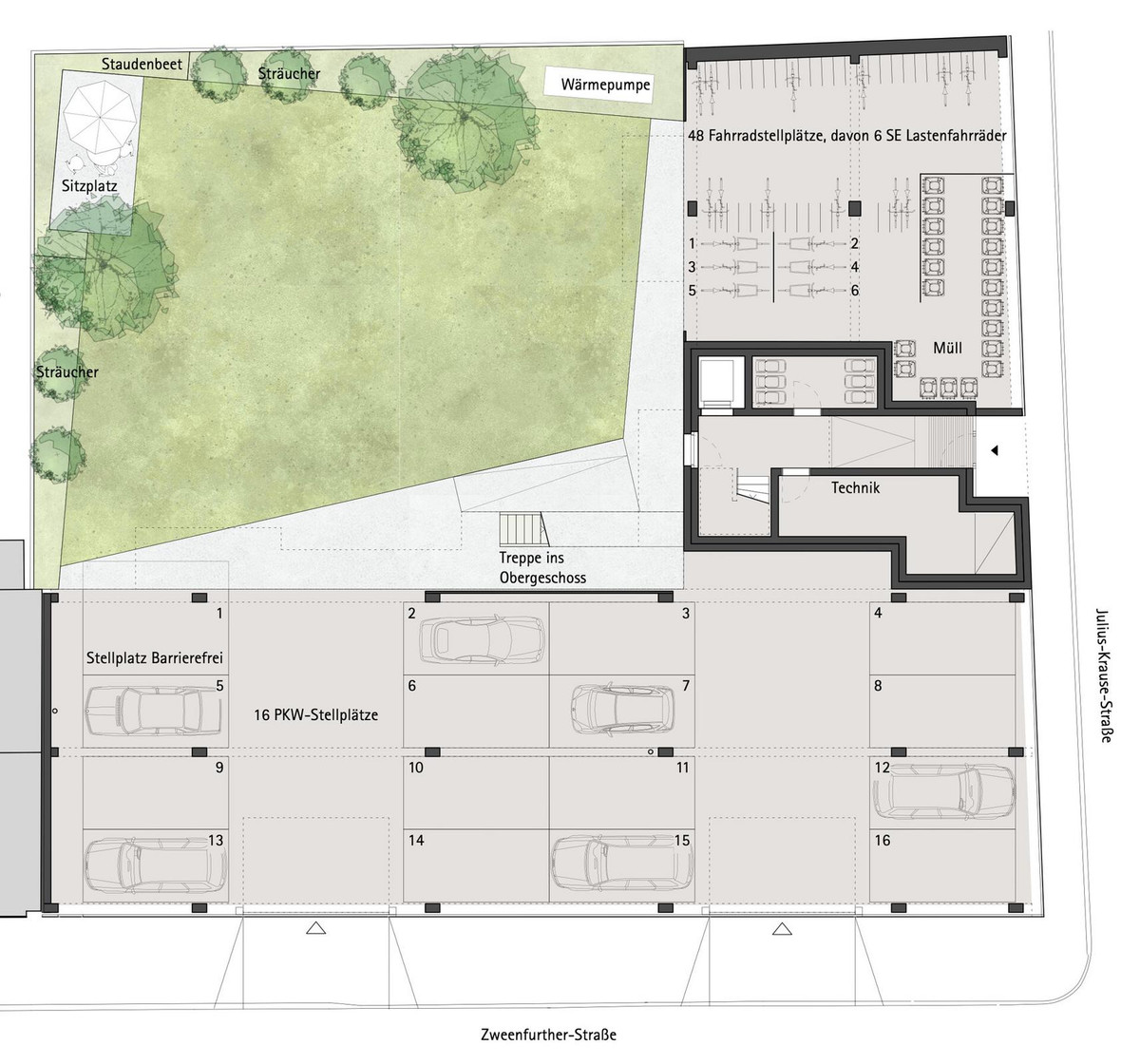 Die Wohnungsgrößen haben wir so angelegt, dass eine dynamische soziale Gemeinschaft entstehen kann. So finden Familien ebenso ein Zuhause wie Bewohner, die auf der Suche nach einer praktischen Wohnung für den Ruhestand sind. Treffpunkte für die Gemeinschaft sind der Garten und die Dachterrasse.
