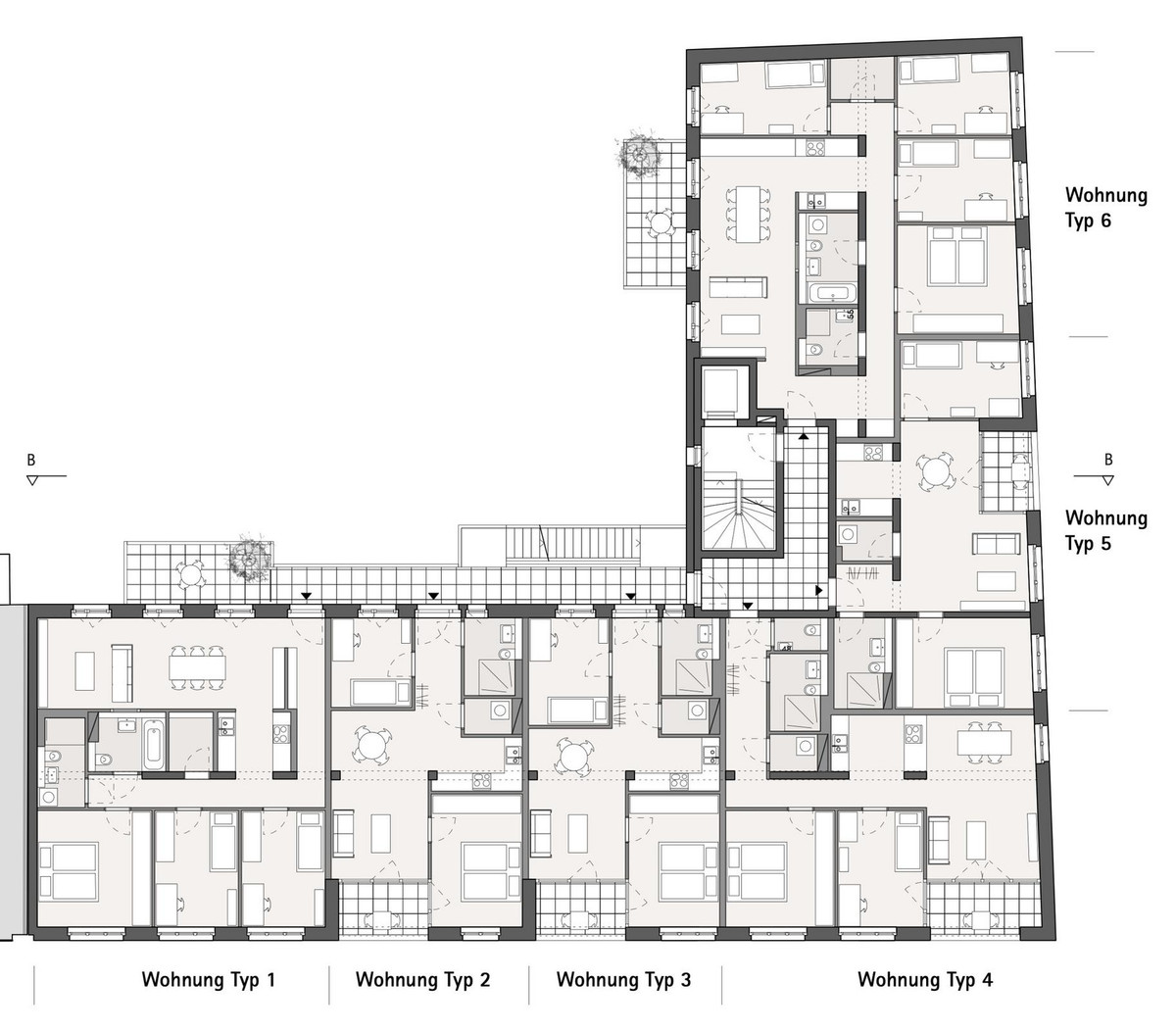 Die Wohnungsgrößen haben wir so angelegt, dass eine dynamische soziale Gemeinschaft entstehen kann. So finden Familien ebenso ein Zuhause wie Bewohner, die auf der Suche nach einer praktischen Wohnung für den Ruhestand sind. Treffpunkte für die Gemeinschaft sind der Garten und die Dachterrasse.