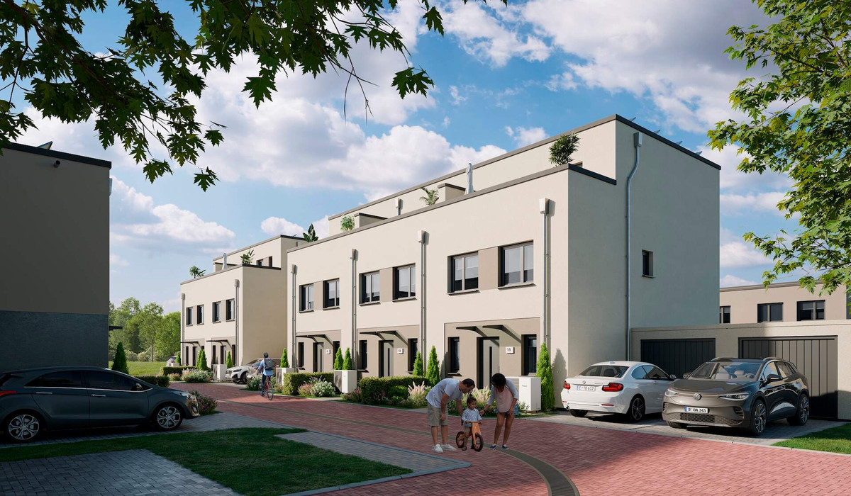 Dieses moderne Reihenendhaus überzeugt mit drei Etagen und einem durchdachten Grundriss für den Familienalltag. Im Erdgeschoss öffnet sich der helle Wohn- und Essbereich zur Terrasse mit Garten. Die offene Küche lädt zum gemeinsamen Kochen ein, ergänzt durch Gäste-WC und Hauswirtschaftsraum. Im Obergeschoss befinden sich zwei Zimmer sowie ein Tageslichtbad mit Dusche und Handtuchheizkörper. Highlight ist das große Studio im Staffelgeschoss mit Zugang zur privaten Dachterrasse – ideal für Hobbys, Homeoffice oder Gäste. Fußbodenheizung sorgt im ganzen Haus für angenehme Wärme. Die Garage direkt am Haus sowie ein Stellplatz bieten komfortable Parkmöglichkeiten. Eine eigene Luft-Wasser-Wärmepumpe, Effizienzhaus-Stufe 55 und Energieklasse A+ runden das nachhaltige Wohnkonzept ab.