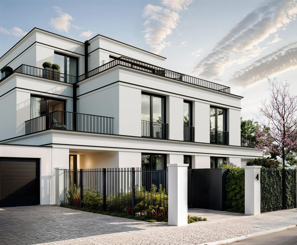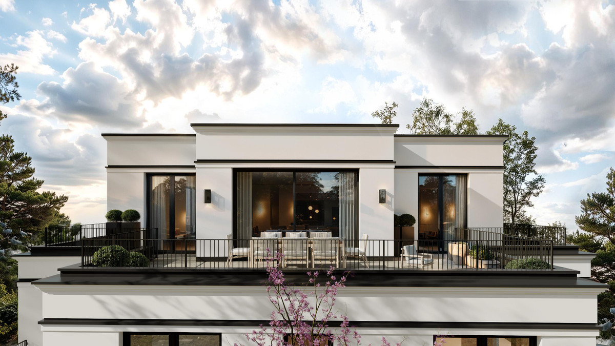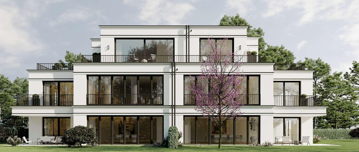 Dieses Bauwerk verbindet stilvolle Architektur mit modernem Wohnkomfort. Das Penthouse beeindruckt mit einer weitläufigen Terrasse, die Wohnungen in der Beletage verfügen über großzügige Balkone, und die Gartenwohnungen bieten private Gärten. Das Ensemble wird durch eine Tiefgarage mit großzügigen Stellplätzen ergänzt.