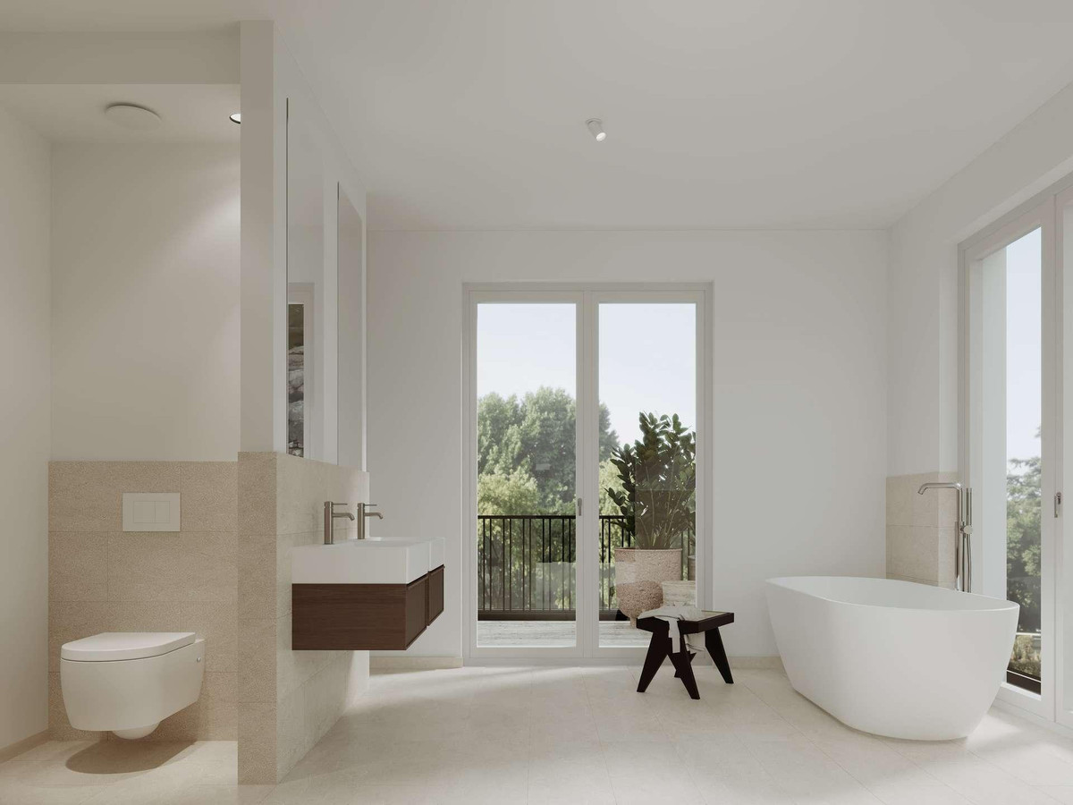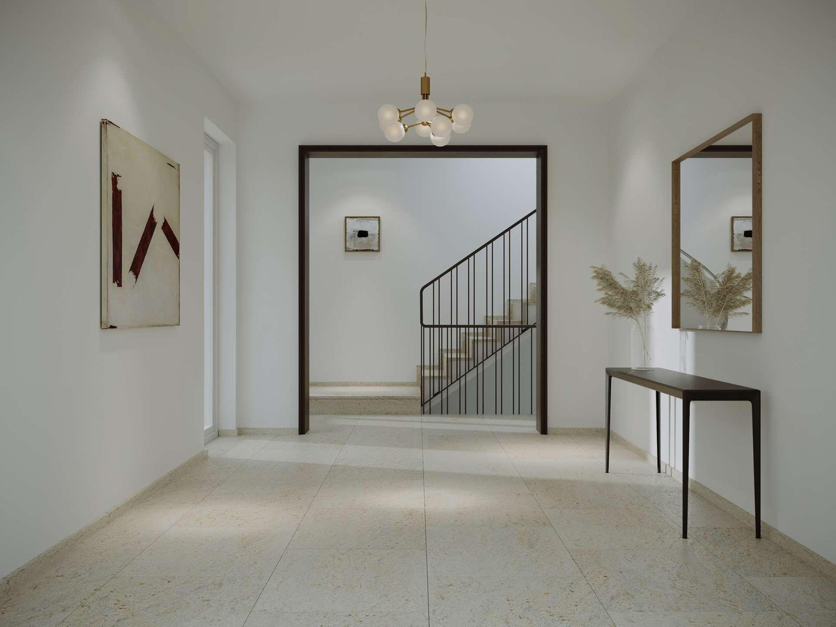 Eine zeitlos gestaltete Fassade, hochwertige Fenster und Naturstein im Eingangsbereich unterstreichen die exklusive Architektur. Innen schaffen großzügige Raumhöhen, edles Landhausparkett und elegante Badausstattungen ein stilvolles Ambiente.