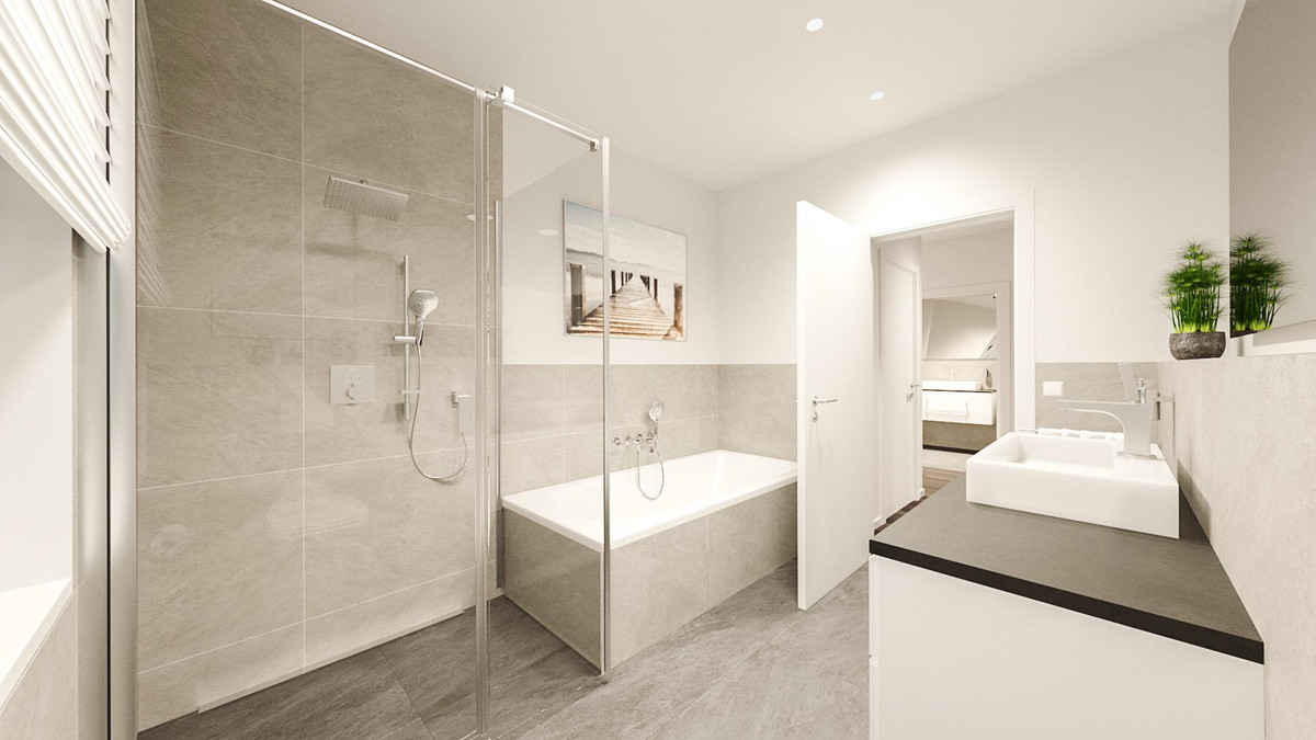 Die Bäder, Duschbäder und WCs werden im Bereich der Dusche raumhoch gefliest, der Rest bis Oberkante Vorwand. Der bodengleiche Duschbereich mit Ablaufrinne und Fliesenmulde erhält eine Klarglas-Duschabtrennung. Über der Waschtischanlage wird in gleicher Breite ein Lichtspiegel montiert. Moderne Deckenspots sorgen für das passende Licht im Bad. Bäder, Duschbäder, WCs und HWR erhalten Fliesenboden.