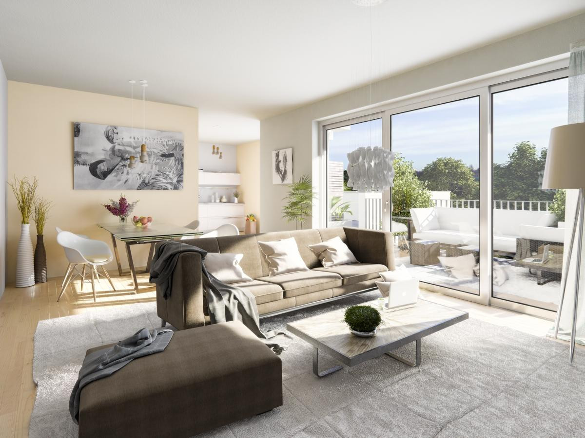 Die Wohnung ist stufenlos zugänglich (auch über die Tiefgarage), verfügt über eine große Dachterrasse, eine offene Wohnküche (auch geschlossen möglich) sowie über zwei vollwertige Tageslichtbäder. Hell und freundlich wird die Wohneinheit durch große Fensterelemente, die optisch schöne Akzente setzen. Praktisch auch der Abstellraum, der Ordnung einfach macht.
