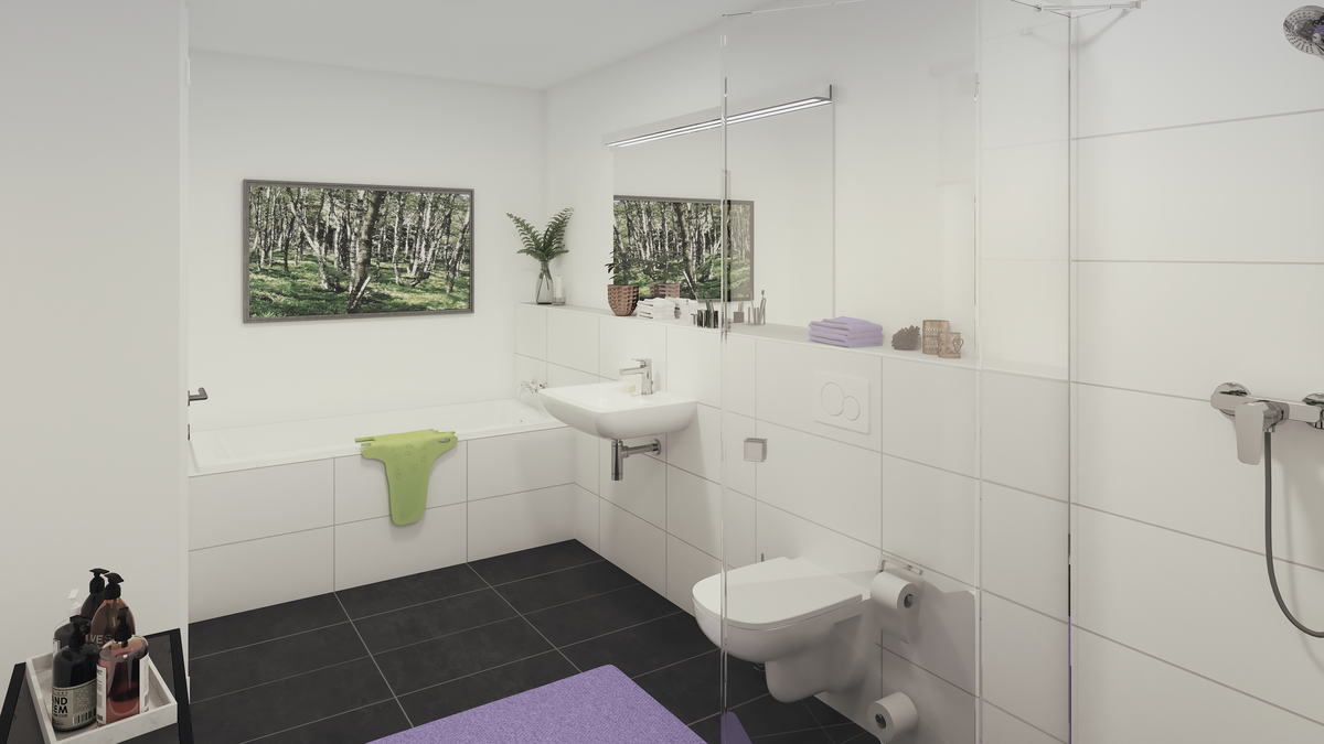 - Voll ausgestattetes Tageslichtbadezimmer mit bodentiefer Dusche inkl. Boden- und Wandfliesen