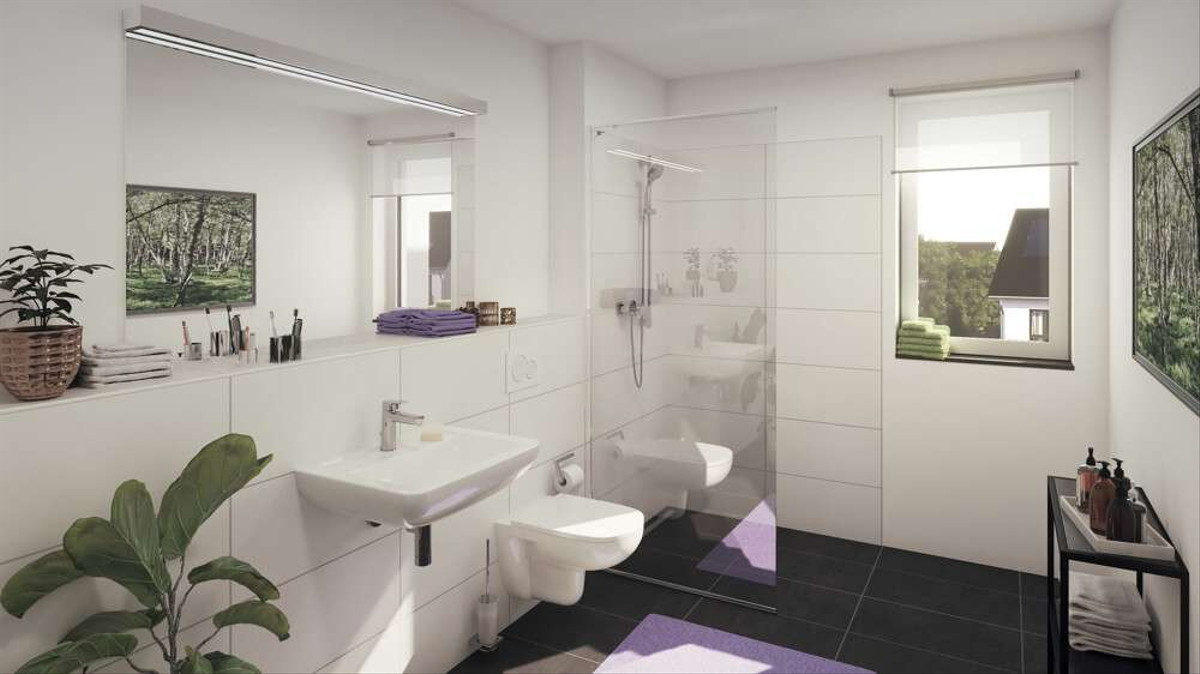 - Voll ausgestattetes Tageslichtbadezimmer mit bodentiefer Dusche inkl. Boden- und Wandfliesen