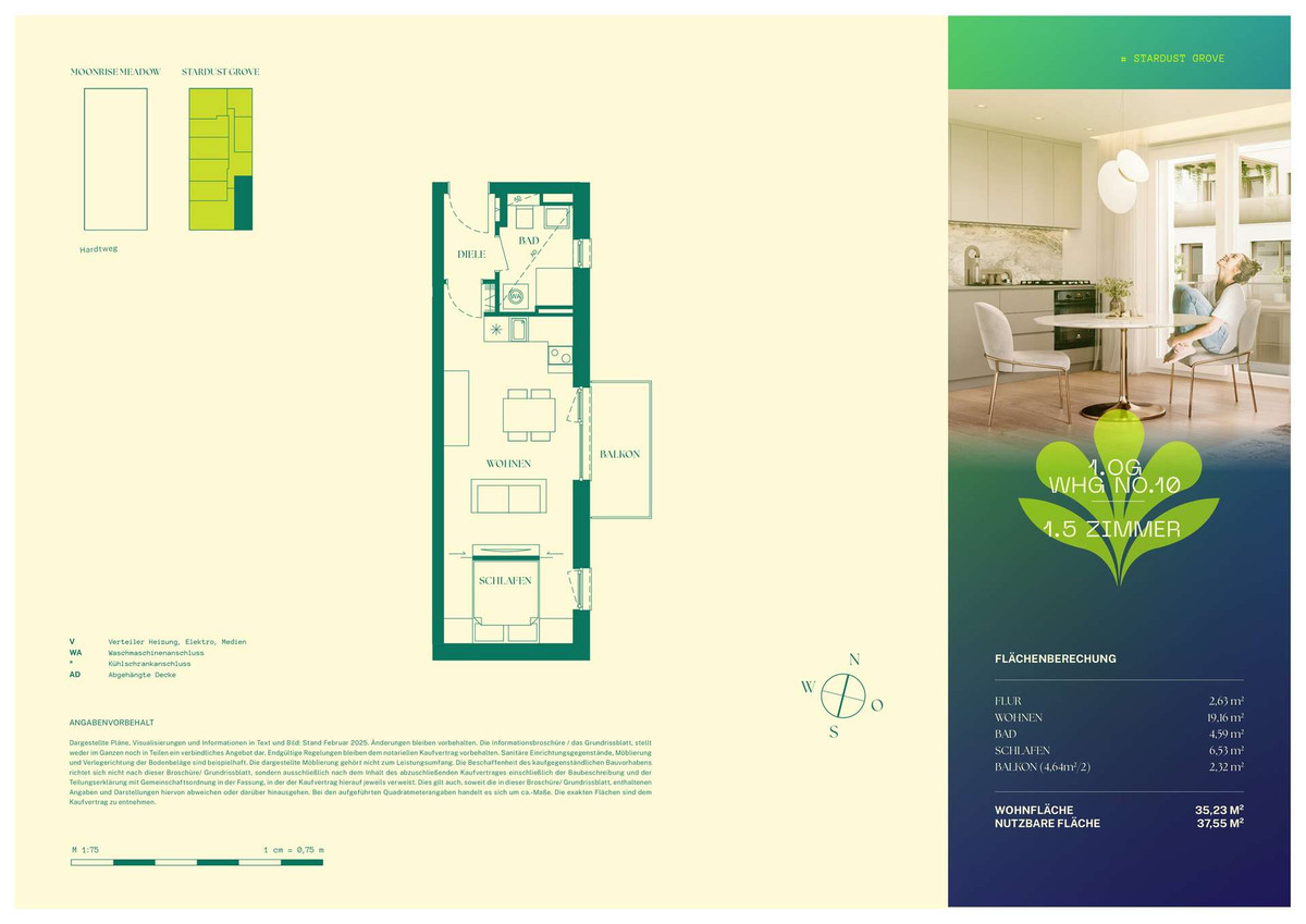 Diese 1,5-Zimmer-Wohnung im Gebäude Stardust Grove zeigt, wie smart 35 m² genutzt werden können: Der Wohnbereich öffnet sich nach Osten zum Balkon und schenkt morgens wohltuendes Sonnenlicht und Helligkeit, während das separate Schlafzimmer einen geschützten Rückzugsort bietet – ein Pluspunkt, der diese Einheit von klassischen Apartments unterscheidet.
