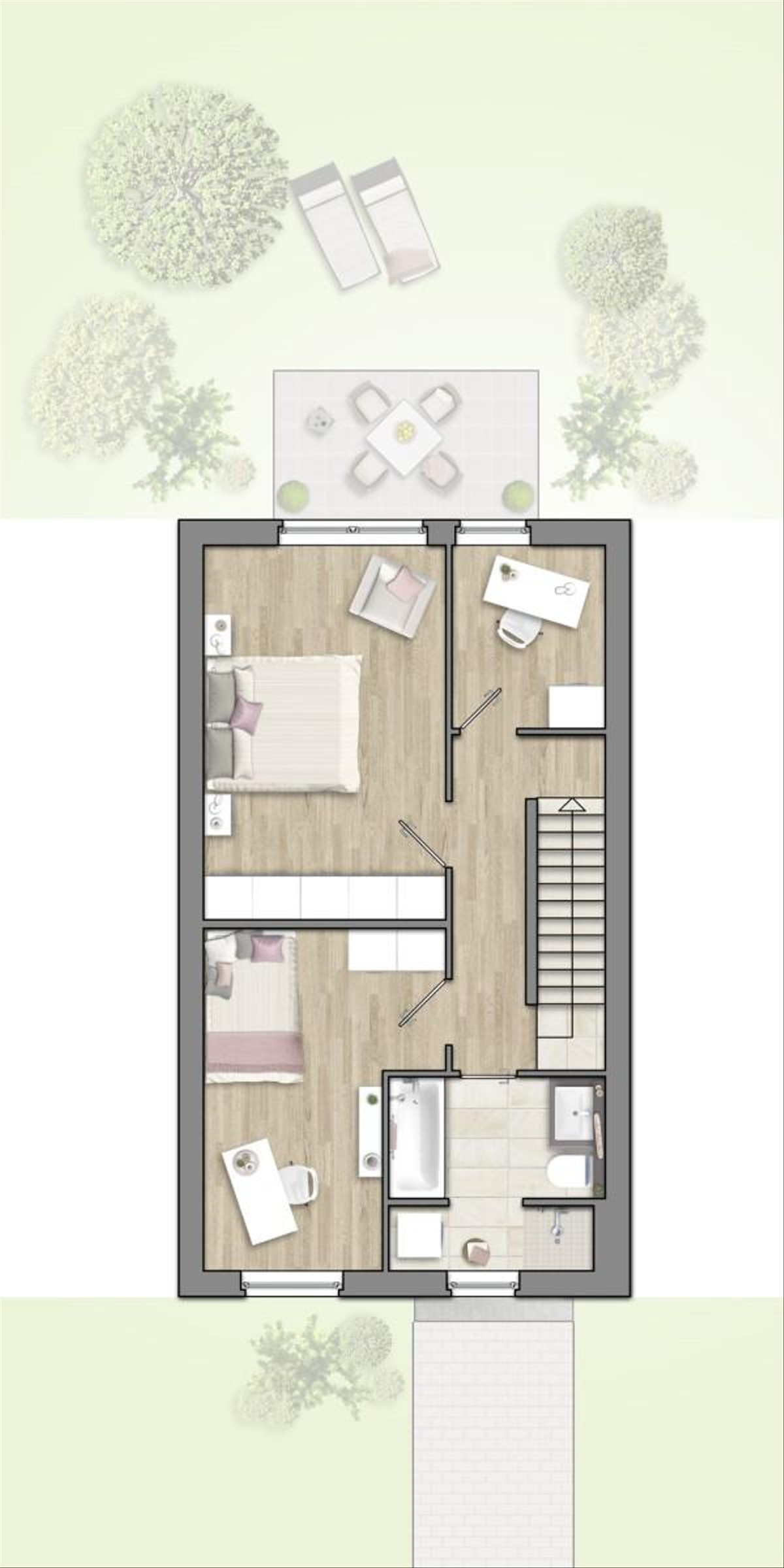 In der Gebgernstraße entstehen Einfamilienhäuser vom Haustyp L mit 129 m² Wohnfläche. Jedes Haus ist mit Fußbodenheizung und fortschrittlichen Smarthome-Funktionen ausgestattet. Das Besondere: Inmitten der einzigartigen Nahe-Landschaft mit ihren zahlreichen Weinhängen lebt man mit viel Natur vor der Tür. Es ist ein ideales Zuhause für alle Familien und Paare, die sich ein perfekt geschnittenes Haus mit eigenem Garten wünschen und zugleich Wert auf eine gute Nachbarschaft legen. Auch Kinder werden hier schnell Anschluss finden. Der nächste Spielplatz liegt nur 200 m von der Gebgernstraße entfernt.
