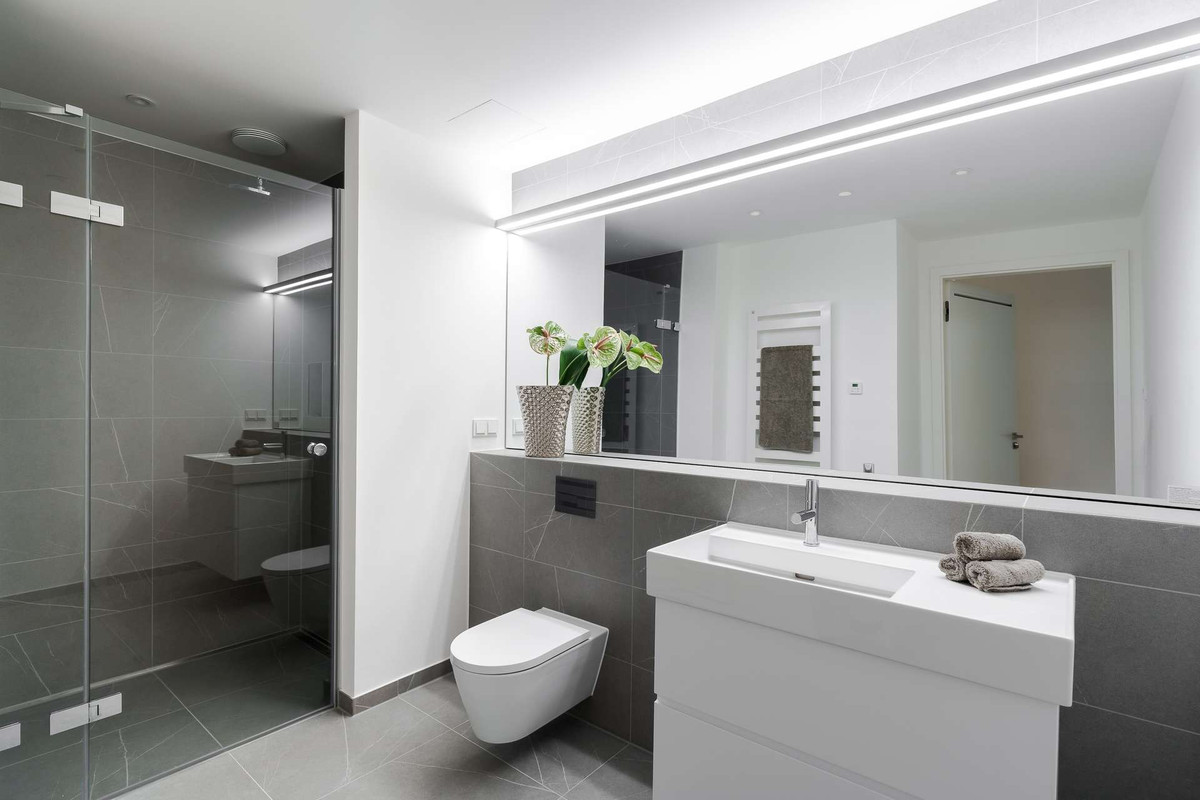 - Beide Bäder ausgestattet mit Downlights, Walk-In-Dusche, modernen Feinsteinzeug Fliesen, Axor-Armaturen, Handtuchheizkörpern, Waschtischunterschrank und beleuchtetem Spiegel