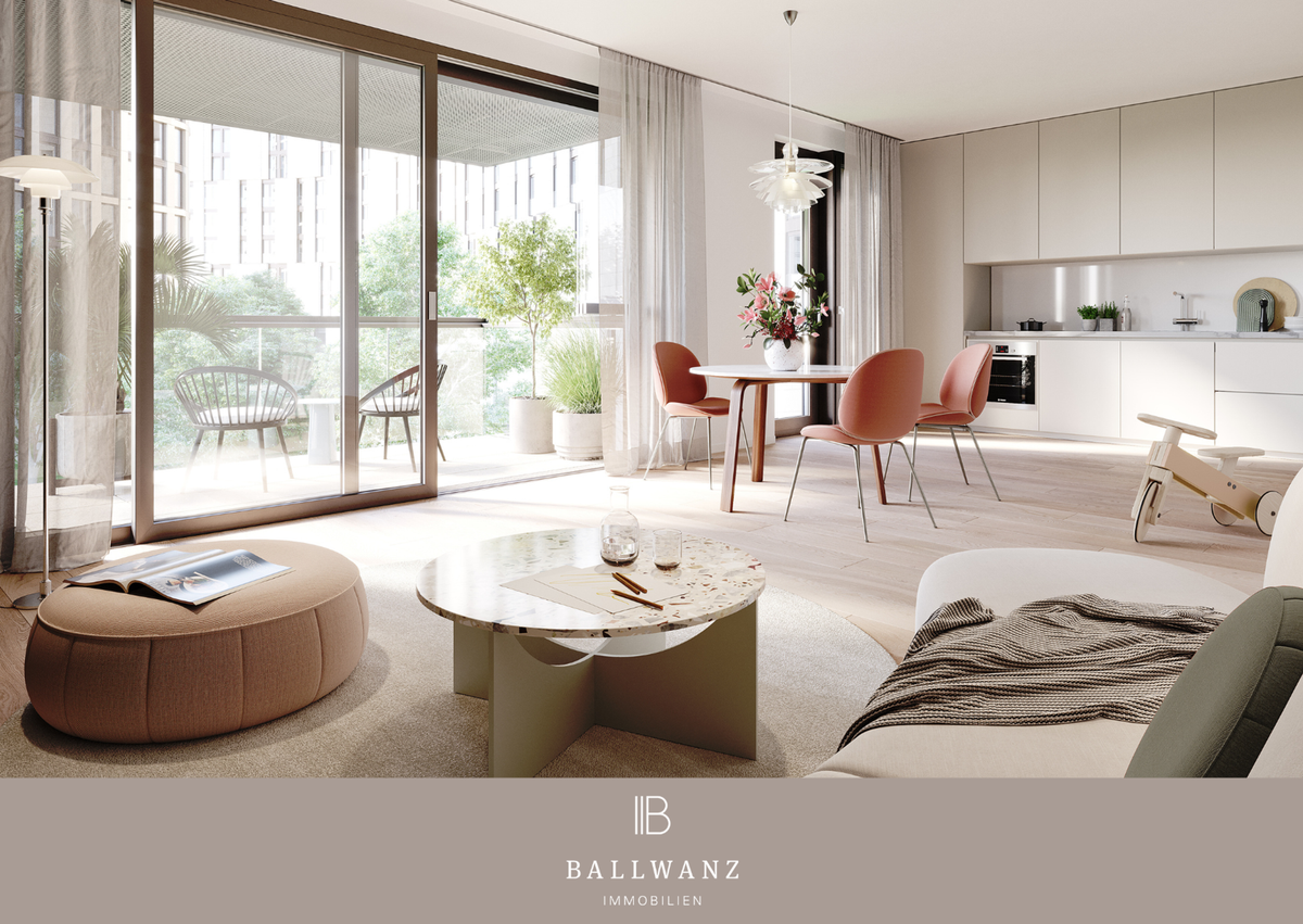 • Balkon mit öffenbarem Glasschutz zum Schutz Ihrer Outdoor-Möbel und Blick auf den Quartierspark