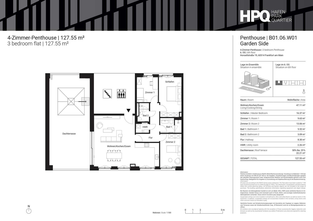 Dieses nach Westen ausgerichtete 4-Zimmer-Penthouse bietet auf ca. 128 m² ein durchdachtes Raumkonzept mit lichter Raumhöhe von ca. 2,75 m. Bodentiefe Fenster lassen das Tageslicht zu jeder Zeit strahlen und schaffen eine freundliche Wohnatmosphäre.