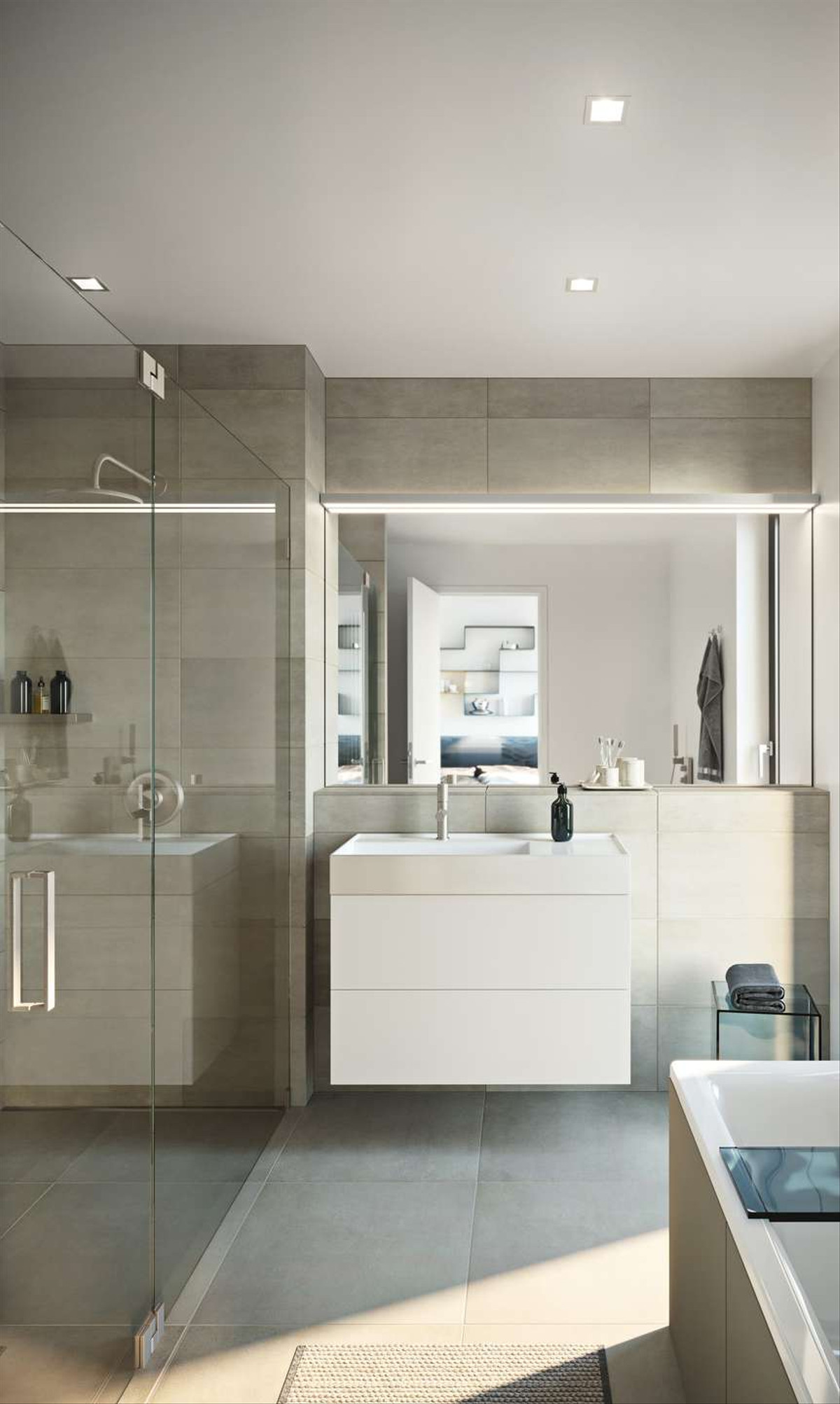 • Hochwertige Badezimmer mit Downlights, Walk-In-Dusche, modernen Feinsteinzeug Fliesen, Axor-Armaturen, Handtuchheizkörper, Unterschrank und beleuchtetem Spiegel