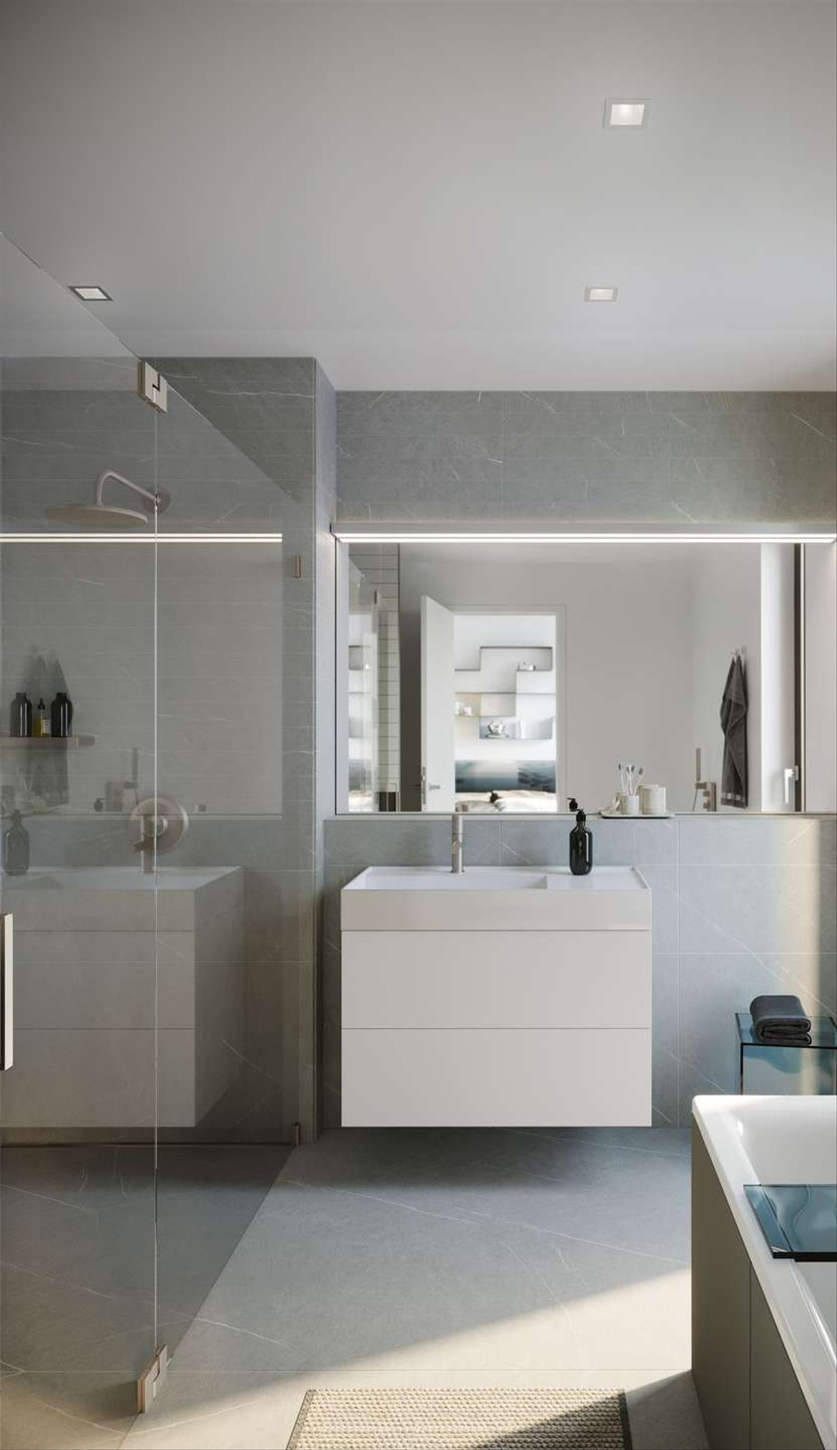 Das stilvolle Badezimmer überzeugt mit einer Walk-In-Dusche, Handtuchheizkörper, hochwertigen Axor-Armaturen, einem beleuchteten Spiegel und einem eleganten Waschtischunterschrank.