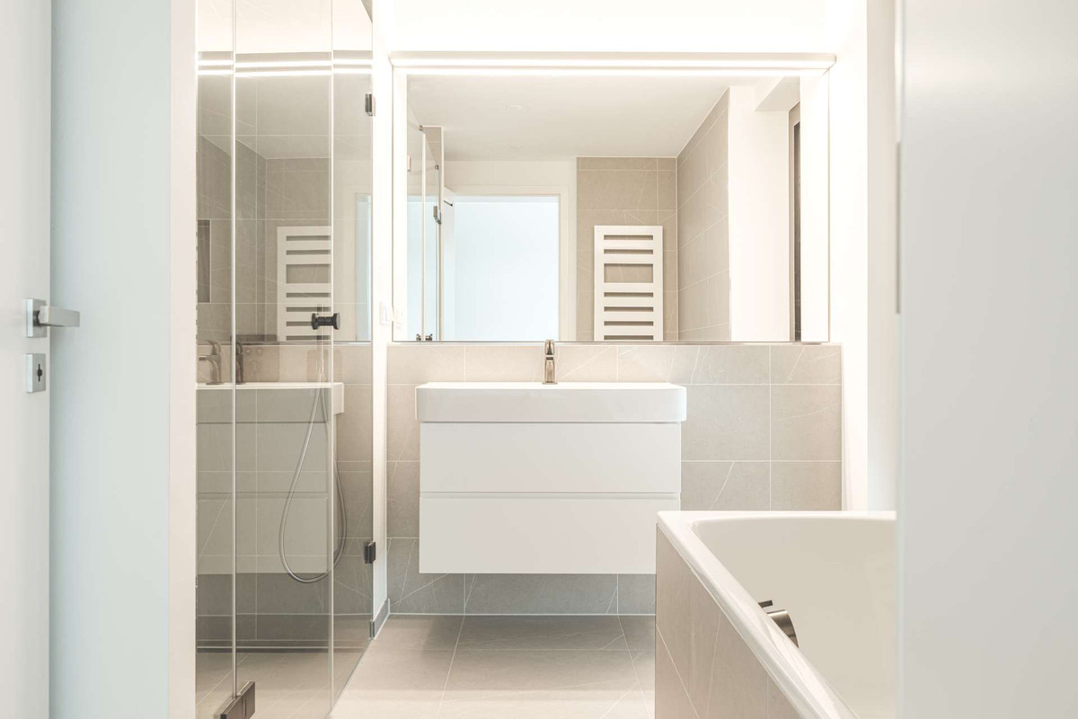 • Hochwertige Badezimmer mit Downlights, Walk-In-Dusche und Wanne, modernen Feinsteinzeug Fliesen, Axor-Armaturen, Handtuchheizkörper, Unterschrank und beleuchtetem Spiegel