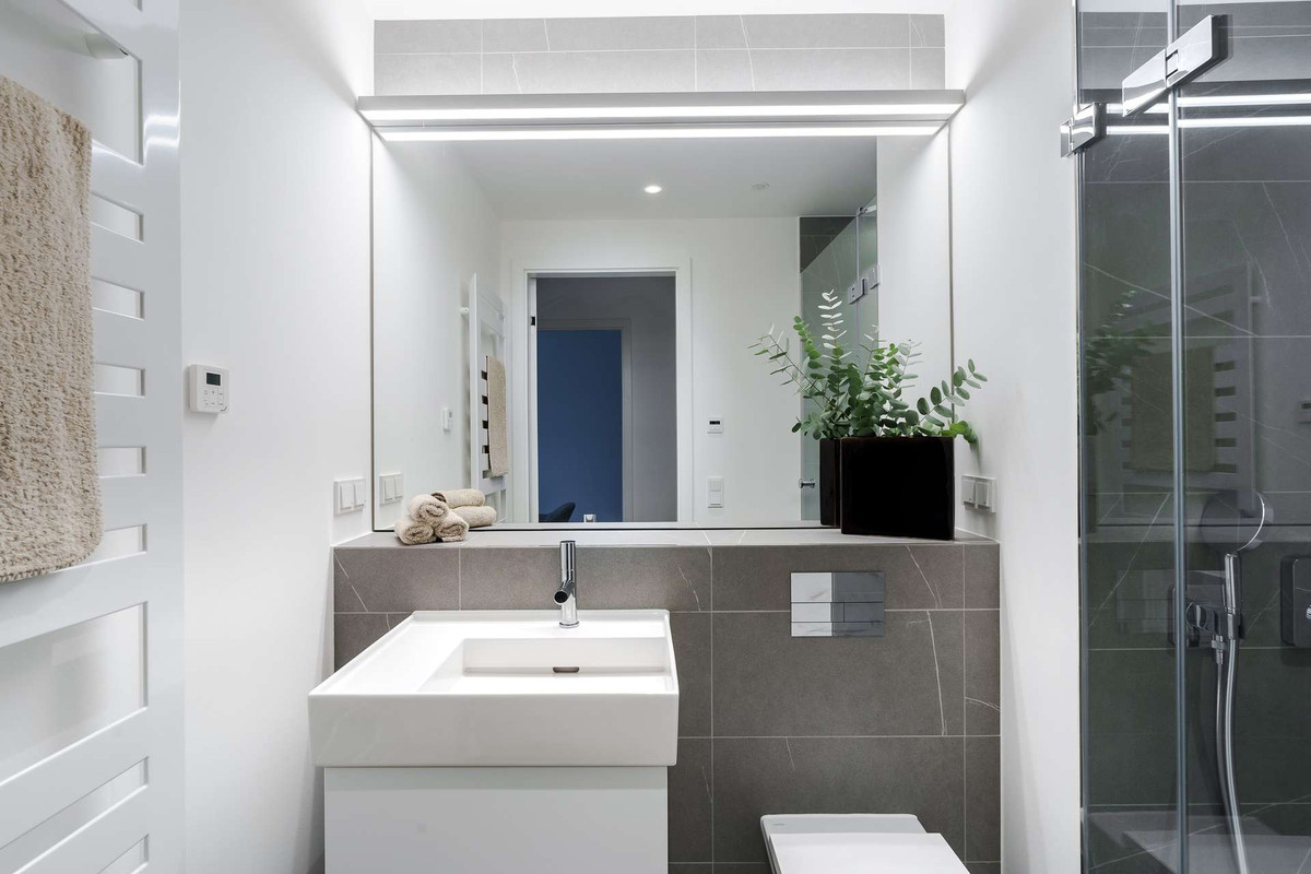 - Zwei Badezimmer, jeweils ausgestattet mit Downlights, Walk-In-Dusche, modernen Feinsteinzeug Fliesen, Axor-Armaturen, Handtuchheizkörpern, Waschtischunterschrank und beleuchtetem Spiegel
