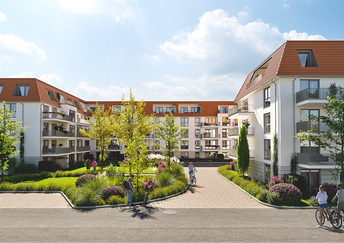 Im Außenbereich des Neubaukomplexes treffen geradlinige Formensprache und ein Mansarddach auf einen abwechslungsreich gestalteten Hofbereich. Innen verteilen sich 103 Wohneinheiten auf sieben Gebäudeteile, ein Erd-, drei Regel- und ein Dachgeschoss. Die Wohnungsgrößen belaufen sich auf ein bis vier Zimmer beziehungsweise circa 34 bis 121 Quadratmeter und sind so ganz auf verschiedene Lebenskonzepte zugeschnitten. Drei wählbare Designlinien mit hochwertigen Fabrikaten namhafter Hersteller eröffnen viel Spielraum für die individuelle Gestaltung von Bädern oder Böden. Raumweise regulierbare Fußbodenheizungen sorgen für ein Plus an Wärmekomfort. An jede der Wohnungen schließen sich zudem ein Balkon, eine Loggia oder eine Terrasse an. Sieben Aufzüge befördern schnell und bequem von allen Wohnetagen bis in das Untergeschoss. Hier widmen sich eine Tiefgarage mit 76 PKW-Stellplätzen und E-Mobilitäts-Ladevorrichtungen sowie ein Fahrrad-/Lastenradkeller Ihrem persönlichen Fuhrpark. Zusätzliche Staufläche bieten praktische Keller- und Kinderwagenräume. Dank nachhaltigem KfW-55-EE-Status behält hans außerdem die Umwelt und Ihr Konto immer im Blick.