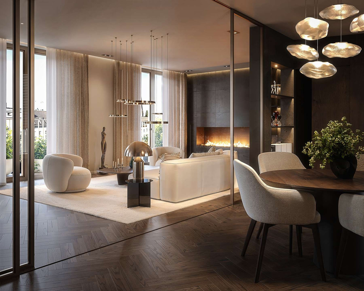In enger Zusammenarbeit mit dem Hamburger Designer Frank Theuerkauf wurde ein Einrichtungskonzept entwickelt, dass den hohen Ansprüchen einer Luxusimmobilie gerecht wird. Offene, lichtgeflutete Räumlichkeiten mit tollen Raumperspektiven und stilvollen Extras wie Gaskamin, deckenhohe Glasschiebeelemente und Einbauten schaffen eine einzigartige Atmosphäre.