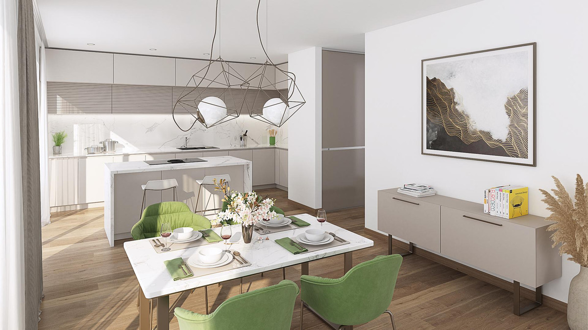 Der offene Wohn-, Ess- und Küchenbereich (ca. 38 m²) bildet das Herzstück der Wohnung. Hier genießen Sie viel Platz für gemeinsames Kochen, Essen und Entspannen.