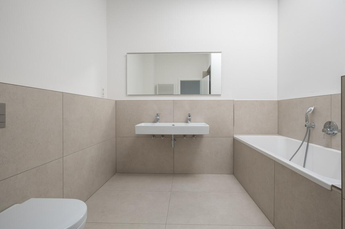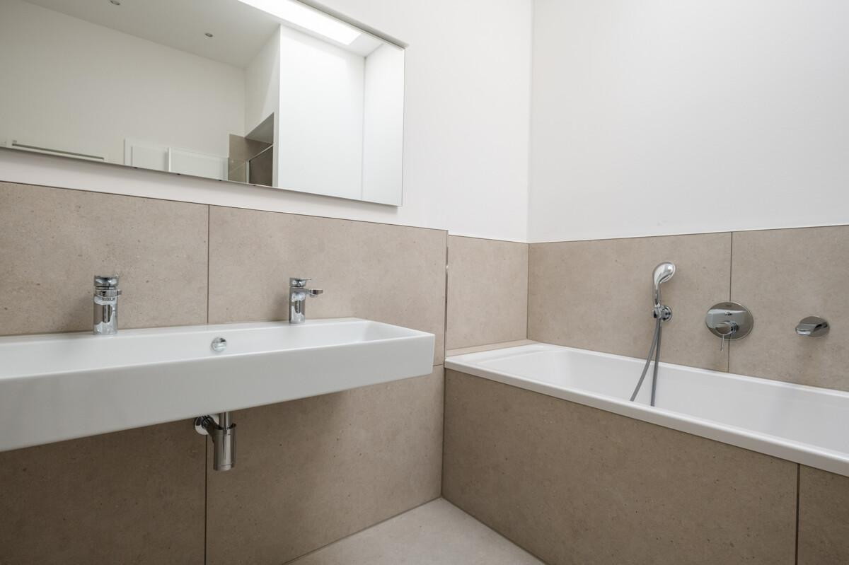 •Großformatige Fliesen und moderne Sanitärobjekte