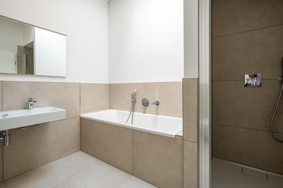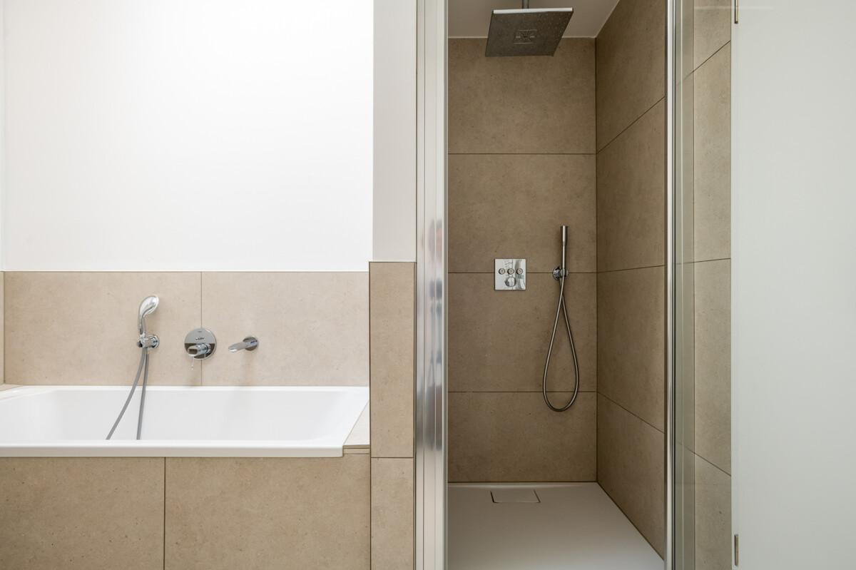Zwei hochwertig ausgestattete Badezimmer setzen luxuriöse Akzente: eines mit Badewanne und bodengleicher Rainshower-Dusche, das andere mit einer bodengleichen Rainshower-Dusche. Edle Materialien, klare Linien und eine stimmige Gestaltung schaffen hier Orte des Rückzugs und der Erholung.