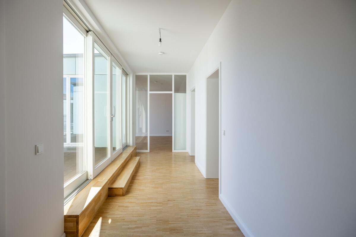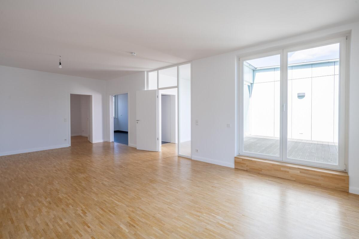 Schon beim Eintreten öffnen raumhohe Fenster weite Blickachsen und lassen die Stadt in die Räume hineinströmen. Das Zentrum der Wohnung bildet der großzügige Wohnbereich mit Zugang zur eindrucksvollen XXL-Terrasse – ein besonderer Ort für den ersten Kaffee bei traumhaften Sonnenaufgängen, entspannte Stunden im Freien oder stilvolle Abende mit Freunden über den Lichtern Berlins.