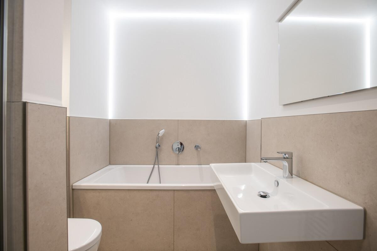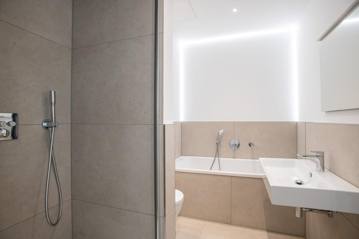 Das Hauptbad präsentiert sich als wahre Wohlfühloase – mit eleganter Badewanne, bodengleicher Dusche und fein abgestimmter Ausstattung. Auch das zweite Badezimmer mit bodengleicher Dusche setzt auf exklusives Design und zeitlose Eleganz.