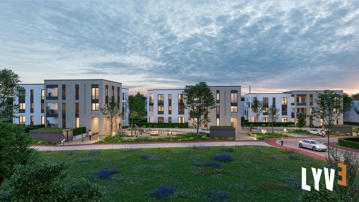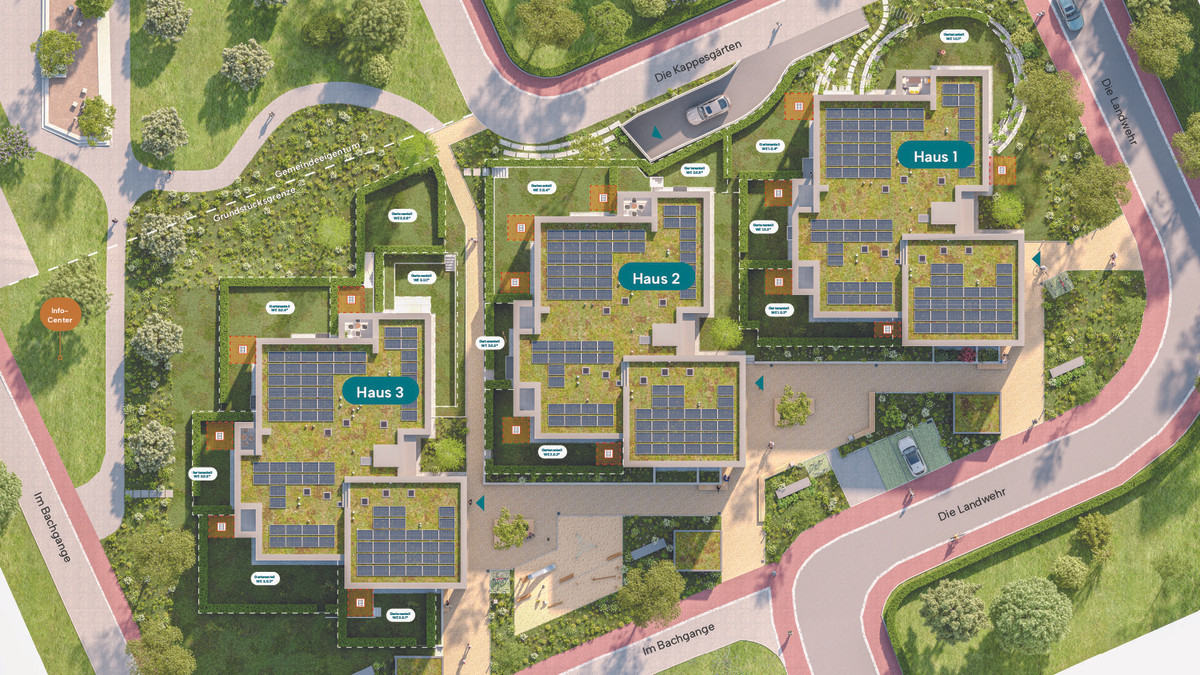 Die drei Häuser sind klar gegliedert und leicht versetzt angeordnet, wodurch großzügige Zwischenräume, Wege und Plätze entstehen. Die Erschließung erfolgt komfortabel über Aufzüge, barrierearme Zugänge und eine zentrale Tiefgarage, deren Zufahrt dezent auf der rückseitigen Grundstücksseite liegt. Durchdachte Wegeführungen verbinden die Eingänge mit den umliegenden Straßen und sorgen für kurze, gut erreichbare Wege im Alltag.
