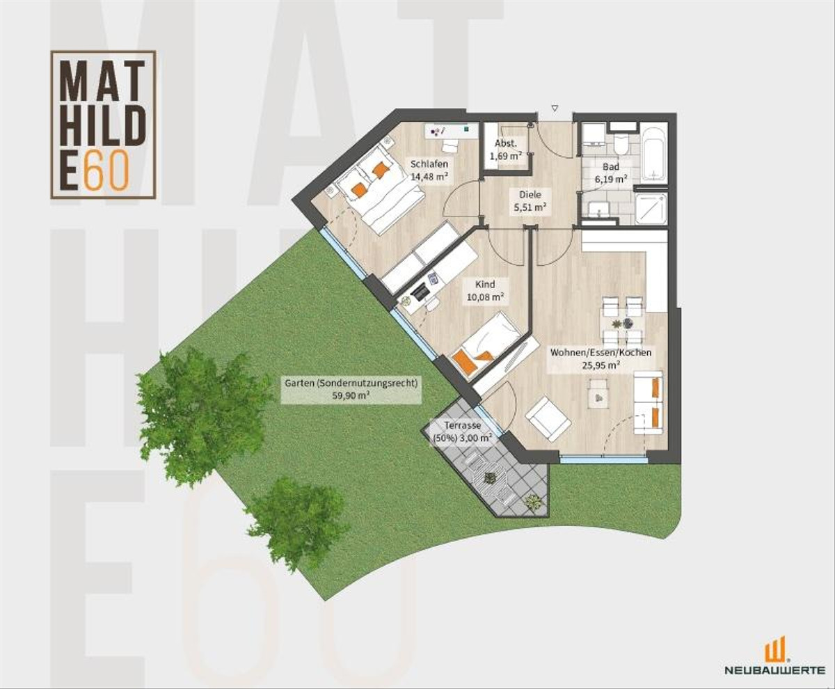 Die ideale Kapitalanlage ist unkompliziert, attraktiv und individuell. MATHILDE60 bietet Ihnen genau das. Wählen Sie Ihre Wunschwohnung mit jeweils zwei bis drei Zimmern und 49 bis 85 m² Wohnfläche. Allesamt ausgestattet mit Balkon, Terrasse oder Wintergarten und auf Wunsch mit Stellplatz. Ein Invest mit NEUBAUWERTE ist ein zeitgemäßes Invest. Maßgeschneiderte Finanzierungskonzepte orientieren sich an Ihren Möglichkeiten. Und umfassende Standortanalysen und Verwaltungsservices lassen Sie sicher und vorausschauend planen und managen.